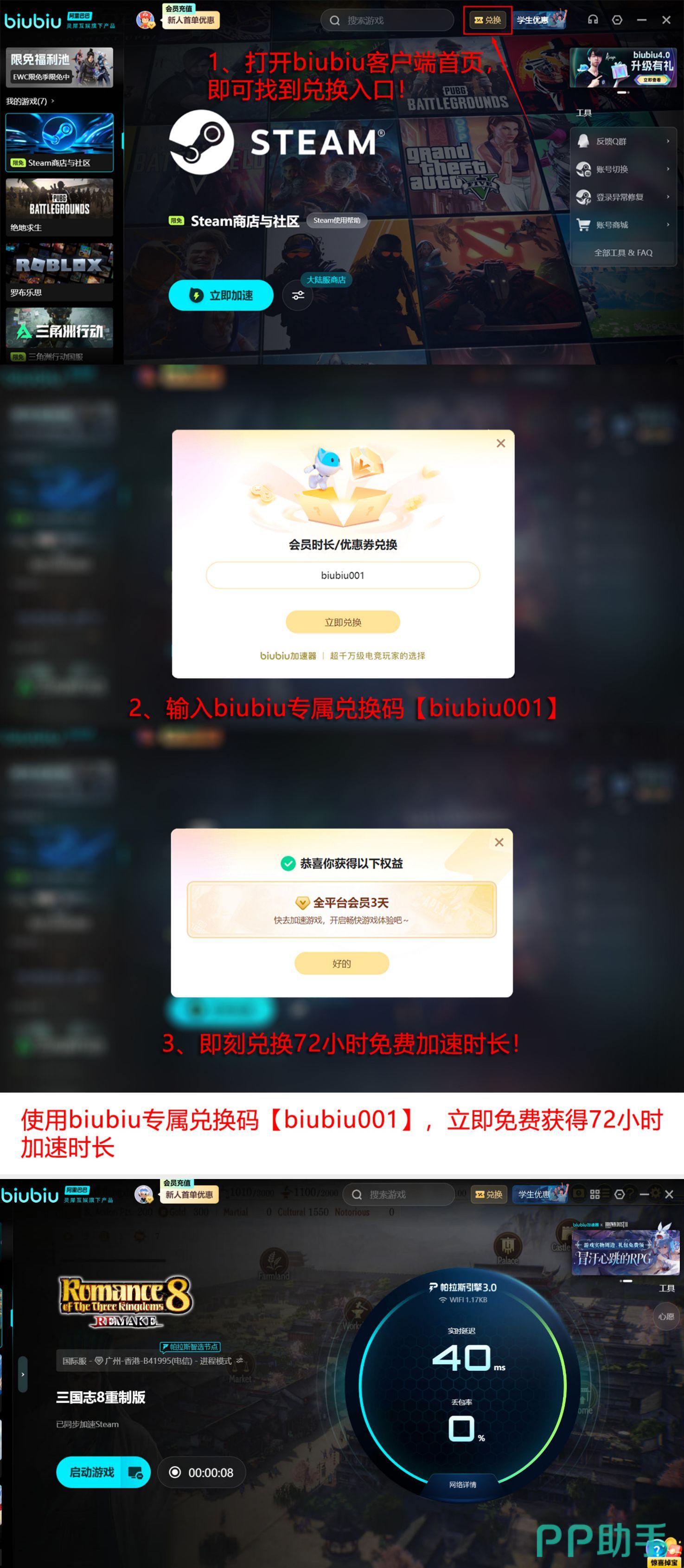 biubiu加速器由阿里巴巴灵犀互娱旗下团队研发,集成自研帕拉斯3.0引擎,为《三国志8》等电竞级策略游戏提供底层网络稳定性保障,构建高效可靠的运行环境。该产品已被pero战队指定为赛事合作加速器。当前新老用户均可通过兑换入口输入指令【biubiu001】领取三天免费加速时长;新用户注册后还将额外获赠24小时专属加速权益,两项福利叠加最高可达96小时连续使用时长。