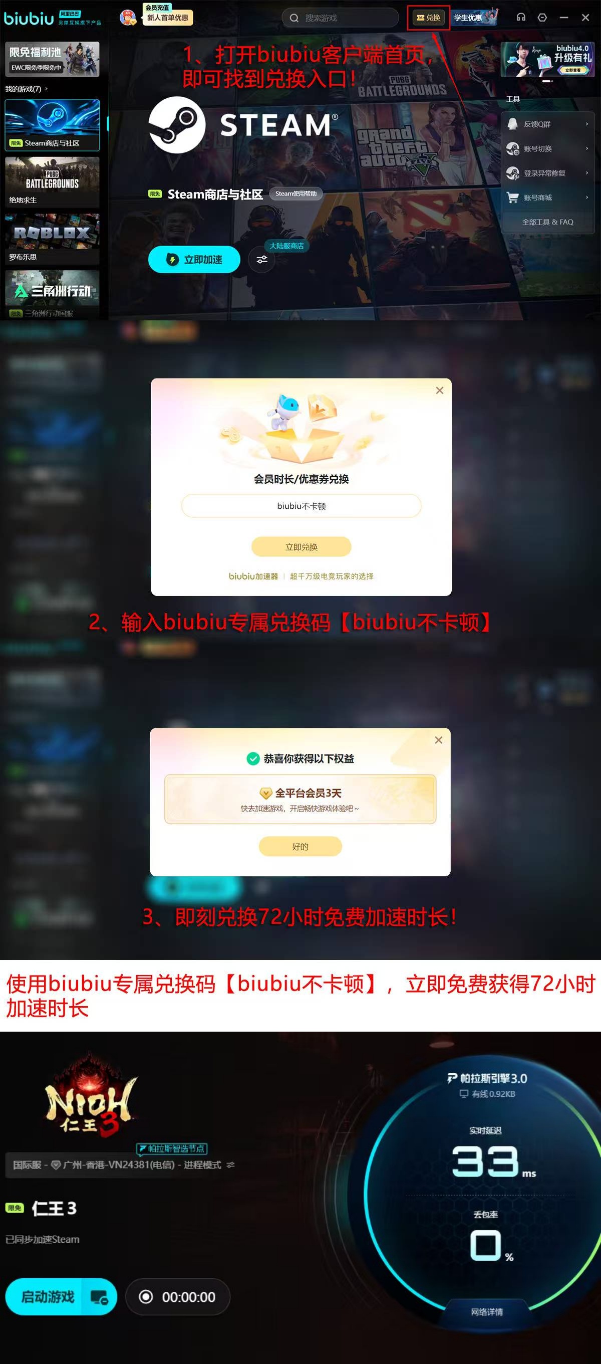针对新用户,平台提供即开即用的加速权益:完成注册并登录后,自动发放24小时免费加速时长;额外输入激活码【biubiu不卡顿】,可叠加获取72小时使用权,累计达96小时。