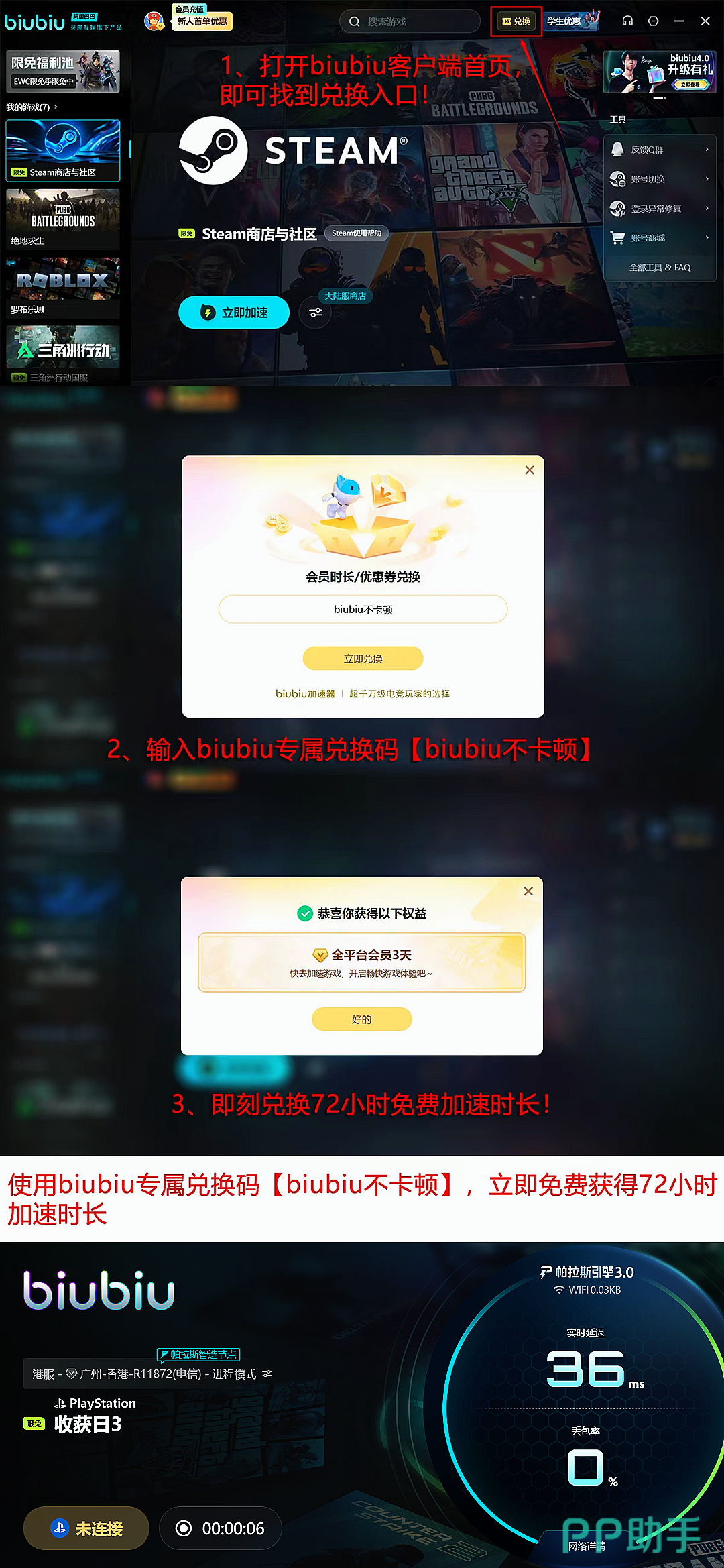 为降低用户使用门槛,biubiu加速器同步推出分层福利体系:所有用户凭兑换码【biubiu不卡顿】即可激活3天全游戏加速权限;新注册用户完成基础认证后,自动获赠24小时通用加速时长。两项权益可叠加使用,新用户最高可享96小时无限制加速服务,覆盖完整新手期与中期副本挑战周期。