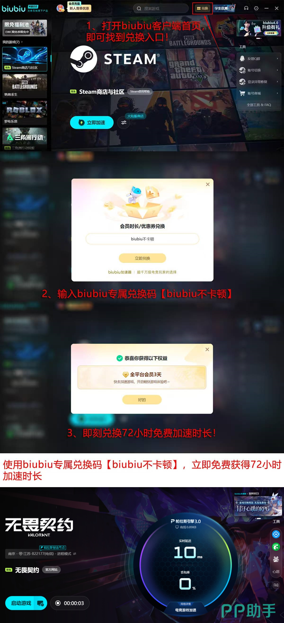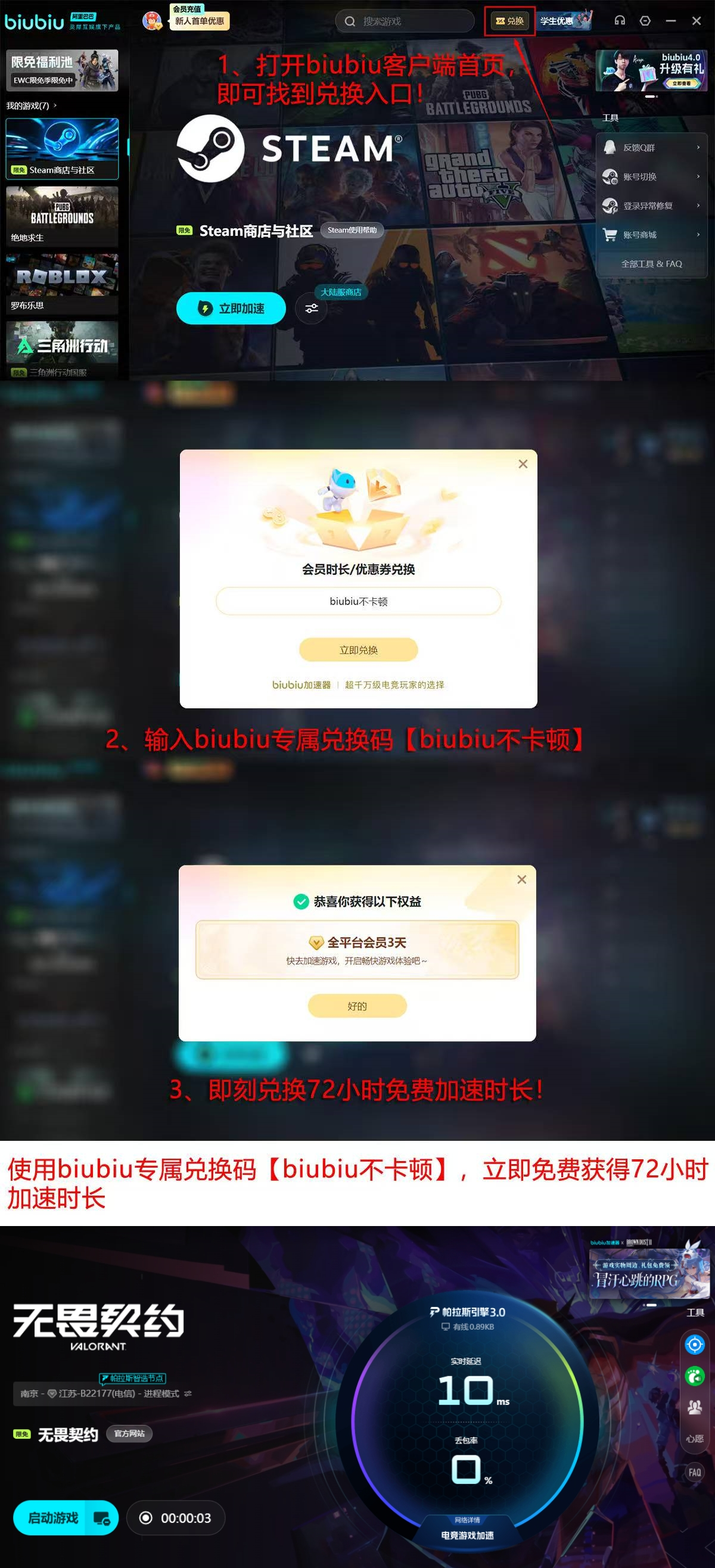 除核心加速性能外,该工具还提供多项实用特性:其一为用户激励机制,当前开放【biubiu兑换码】兑换72小时免费使用时长活动,并同步支持新用户注册免费领取24小时的福利活动,两项权益可叠加使用,总计获得96小时的免费使用时长;其二为全品类游戏覆盖能力,加速库已适配几乎所有市面上能看到的热门游戏,涵盖MOBA、FPS、MMORPG及独立游戏等类型,满足多平台、多场景的网络优化需求。