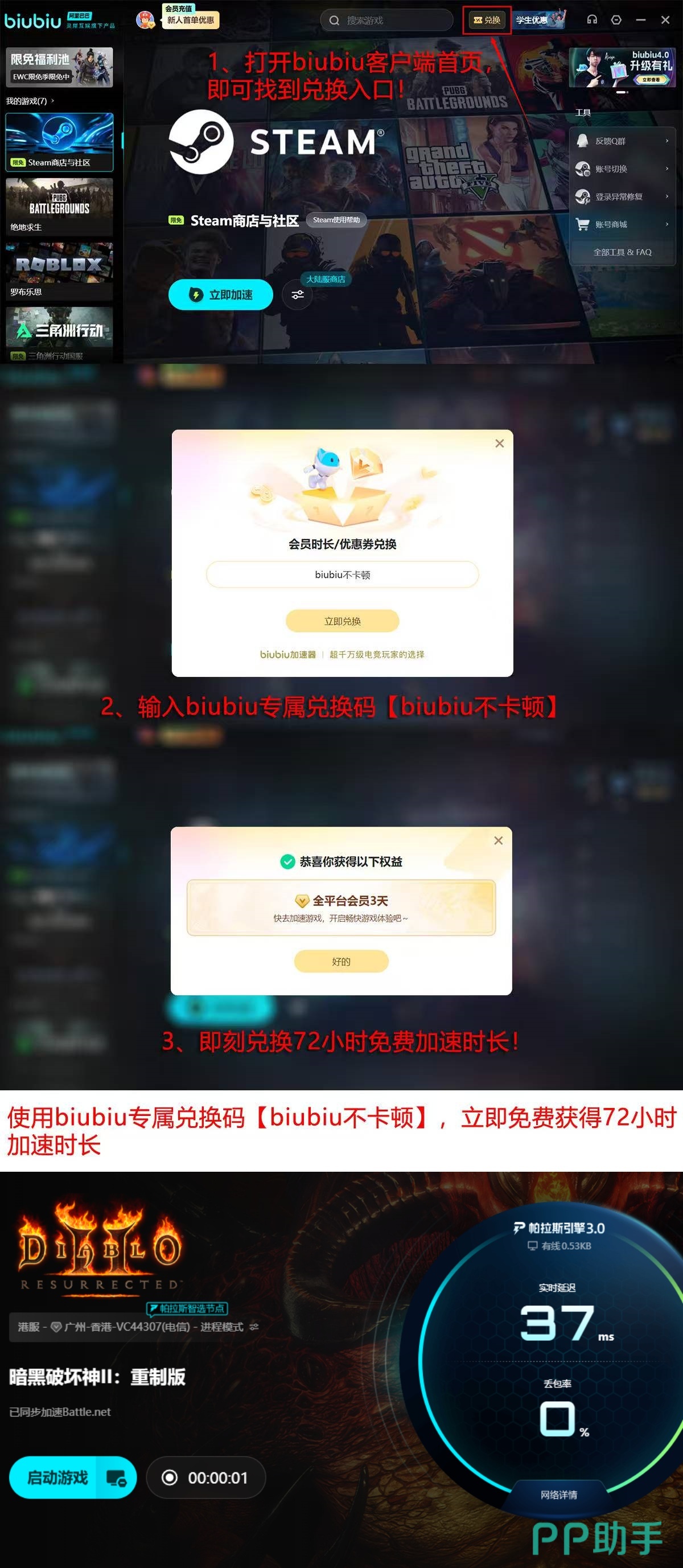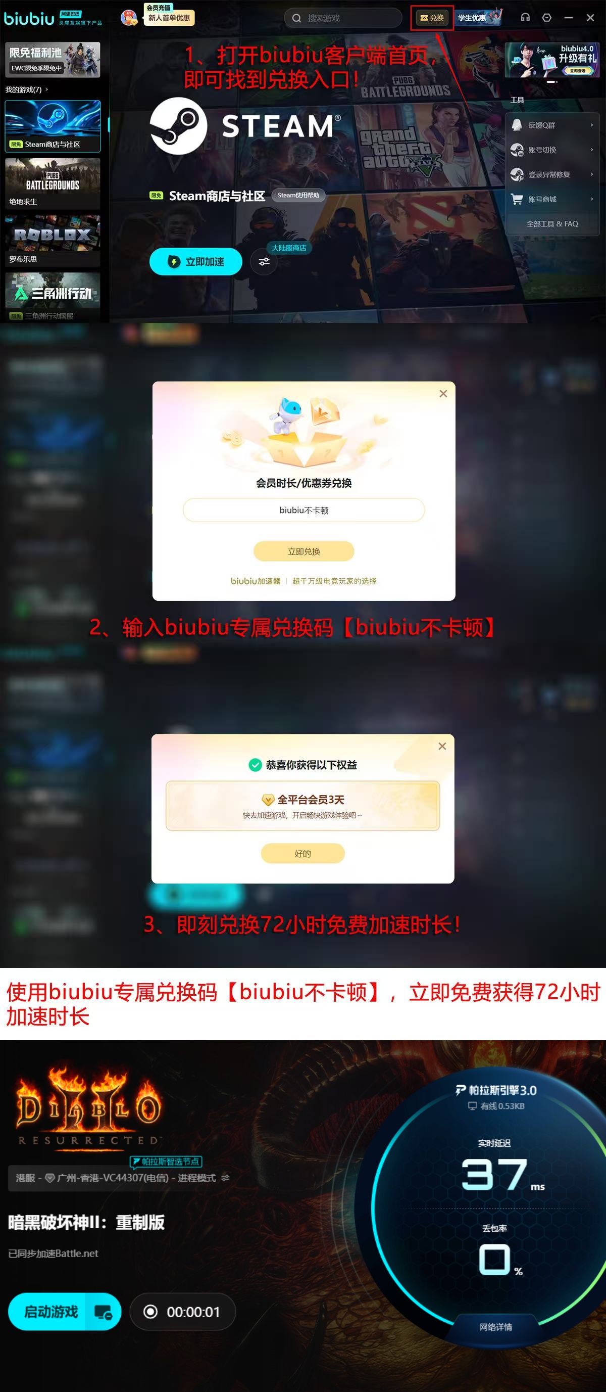 当前新用户注册即可获赠24小时全游戏免费加速权益;使用专属兑换码“biubiu不卡顿”,还可额外领取72小时加速时长,累计享受长达4天的无限制加速服务,覆盖《暗黑破坏神2:狱火重生》及其他主流联机游戏。