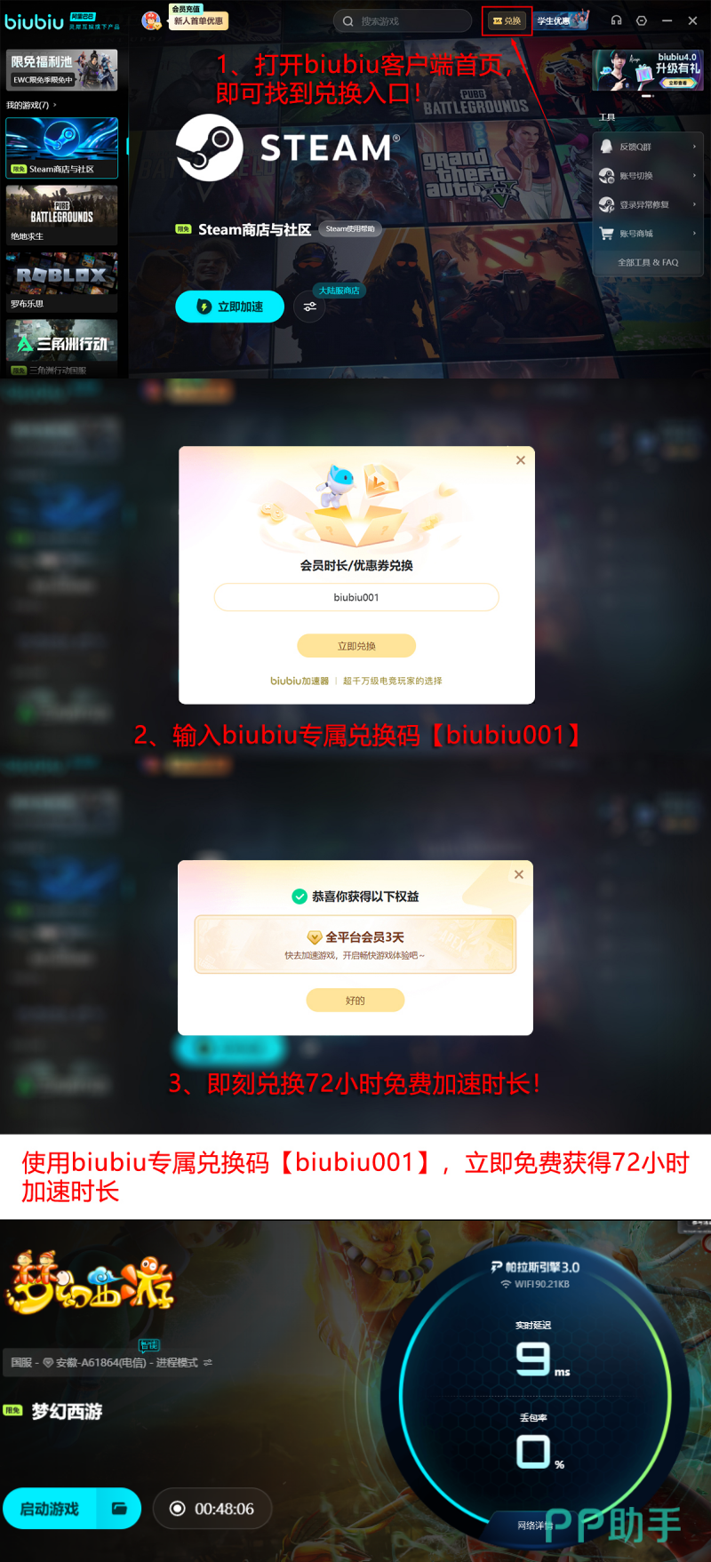 选择biubiu加速器的核心依据有三点:第一,其底层技术支持源自阿里巴巴灵犀互娱,与九游、交易猫同属该生态体系下的重点产品;第二,内置帕拉斯3.0自研加速引擎,专为长周期在线MMORPG设计,在节点稳定性与协议兼容性方面表现突出;第三,已通过PERO职业电竞战队实战验证,成为其官方指定加速方案。目前新用户注册即可获赠24小时免费加速时长,另可通过专属口令【biubiu001】额外领取3天权益,两项福利叠加最高可达96小时。全程一键启用,无需手动配置复杂参数。