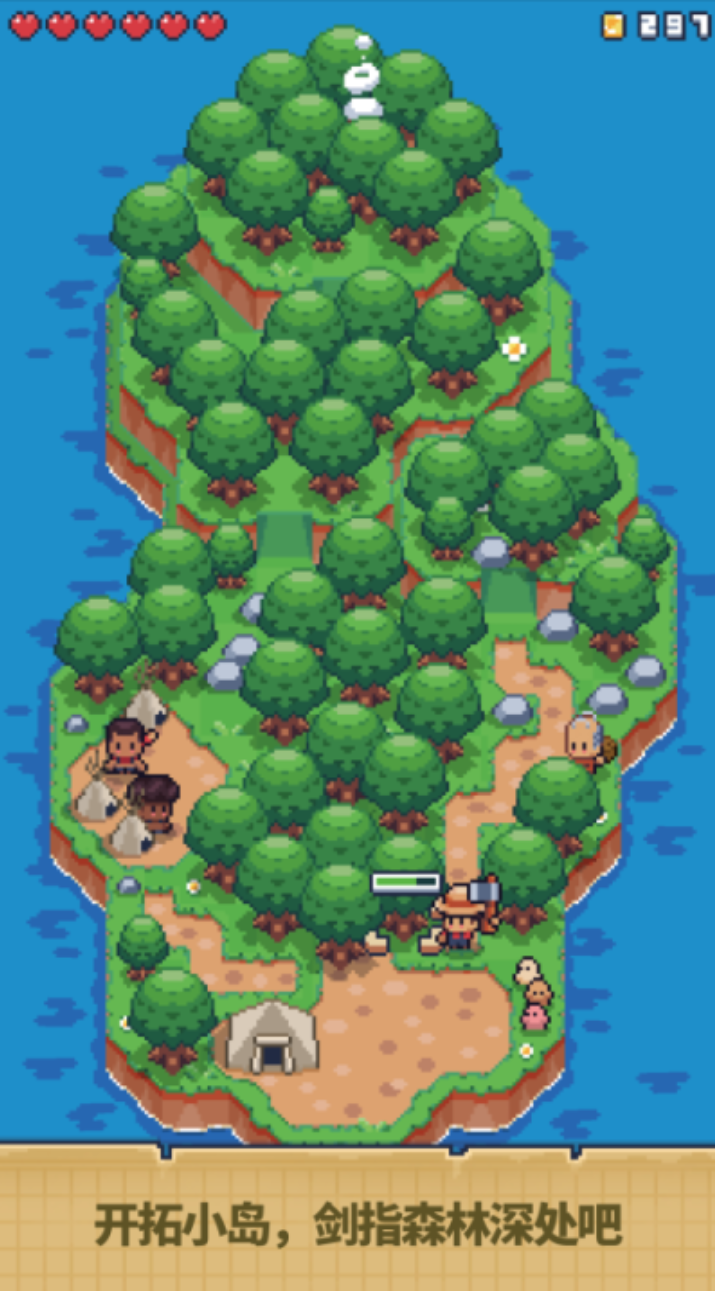 采用经典像素美术风格,开局仅有一把铲子,玩家将在未知小岛苏醒,立即进入采集、建造、防御的循环节奏。伐木搭棚以保存体力,以石制镐提升挖掘效率;商人系统支持金币兑换装备,解锁武器后可拓展探索边界。夜间威胁显著增强,森林暗处潜伏猛兽;主线任务围绕解救被困精灵展开,烟雾信号与洞穴遗迹中埋藏着离岛关键线索。