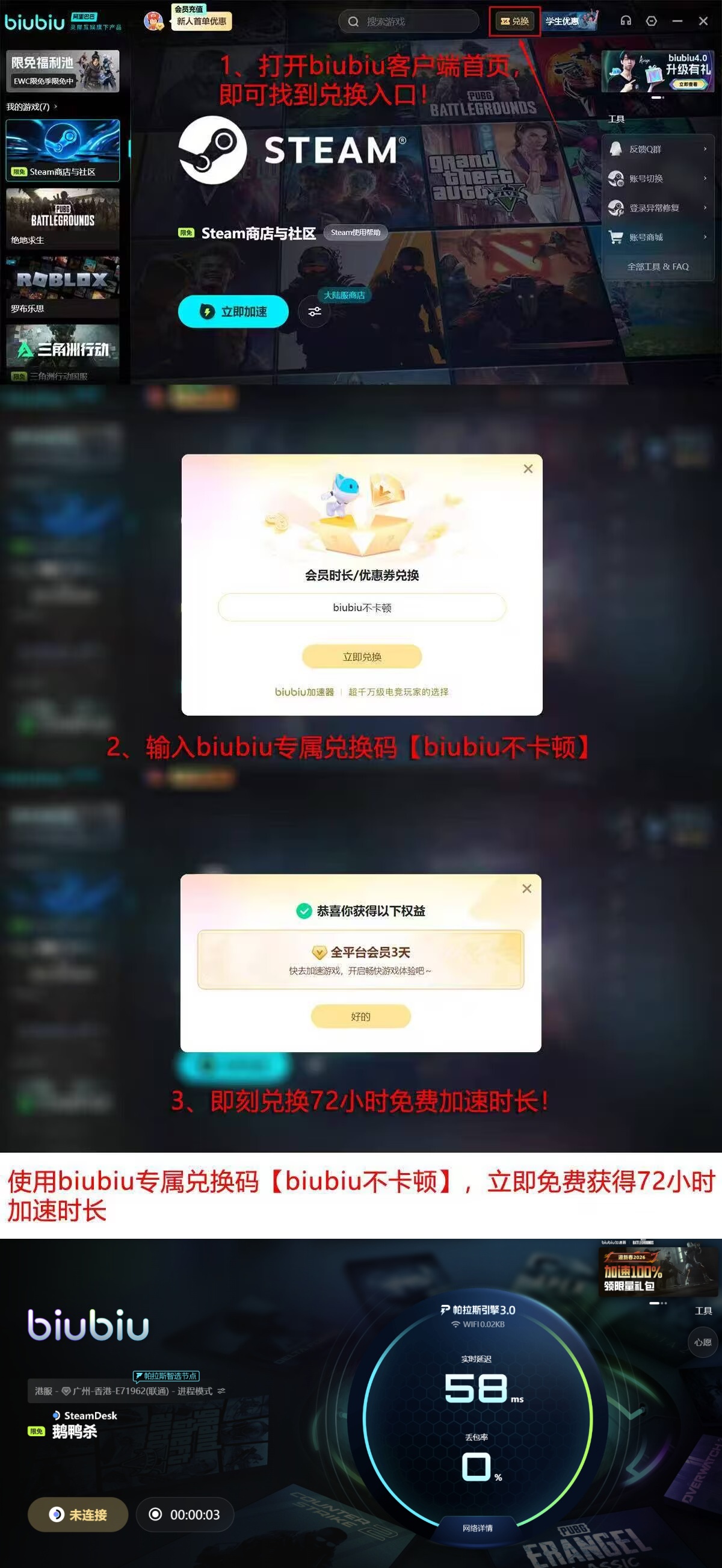 为提升用户使用便利性,biubiu加速器同步推出多项新手权益:新用户完成首次注册登录后,即可获赠24小时全功能免费加速时长,涵盖平台全部游戏及工具服务;后续通过参与老带新活动,正确输入【biubiu不卡顿】口令,还可额外领取3天高级会员权限,总计96小时限时免付费体验,足以支撑多轮完整派对局体验。