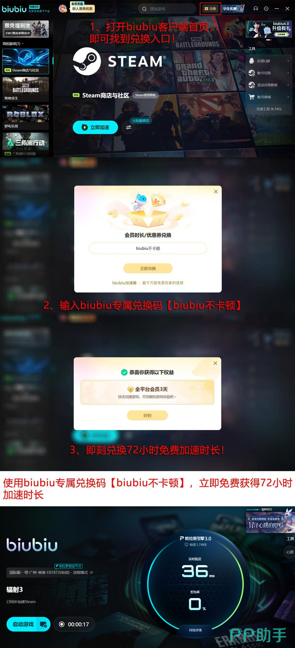 除核心性能外,biubiu加速器同步提供高价值用户权益:输入指定兑换码【biubiu不卡顿】,即可激活72小时全功能加速权限;若为首次注册的新用户,还可额外获赠24小时加速时长,累计享有96小时免费体验期。该福利力度在当前加速服务市场中具备显著差异化优势。