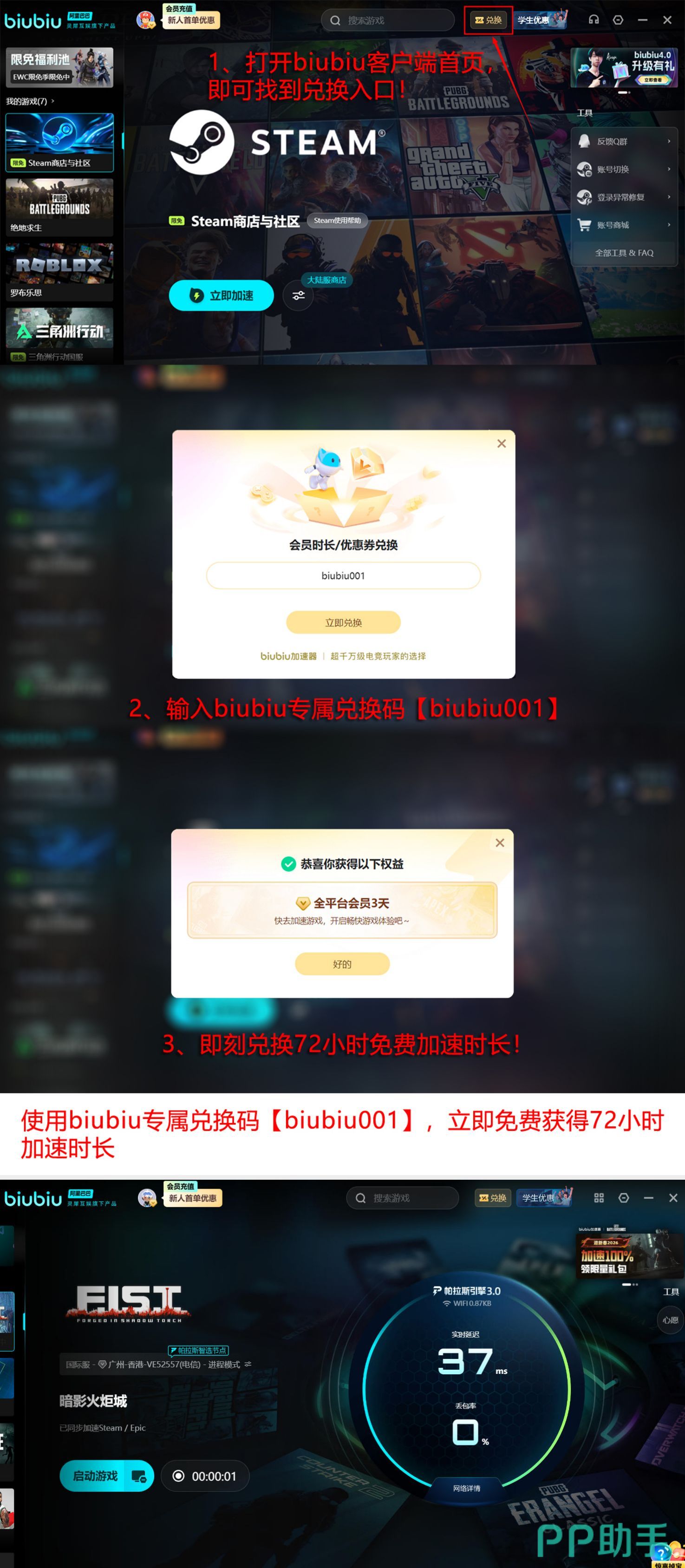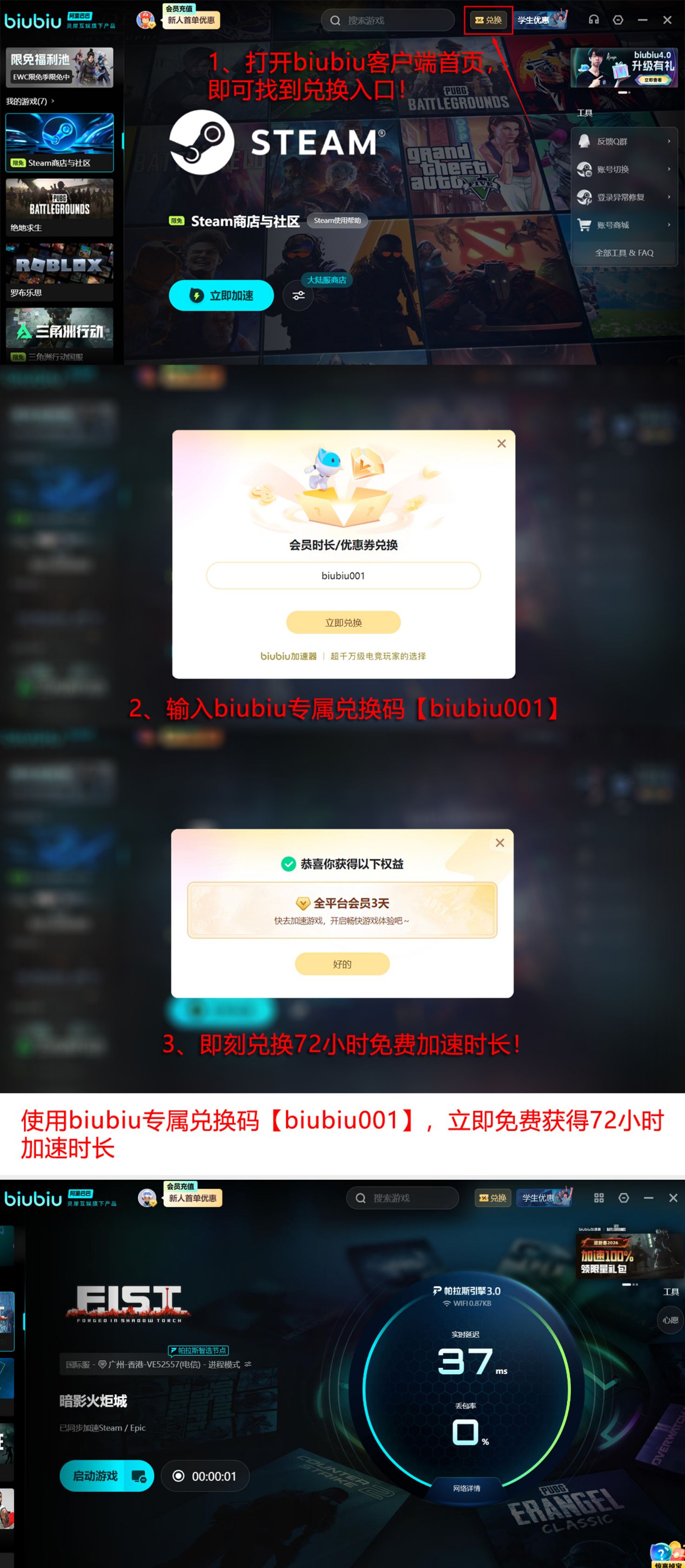 在主流加速方案中,biubiu加速器具备明确技术优势:其为阿里巴巴灵犀互娱旗下产品,与九游、交易猫同属同一研发体系;内置帕拉斯引擎3.0版本,通过智能路由调度与TCP协议栈深度优化,在弱网条件下仍可保障关键游戏数据零丢包传输。操作界面简洁,启动后自动匹配最优节点,兼容安卓/iOS/PC多端。新用户注册即赠24小时全功能试用权限;输入兑换码【biubiu001】可额外获得72小时加速时长,两项权益叠加总计可达96小时免费使用周期。