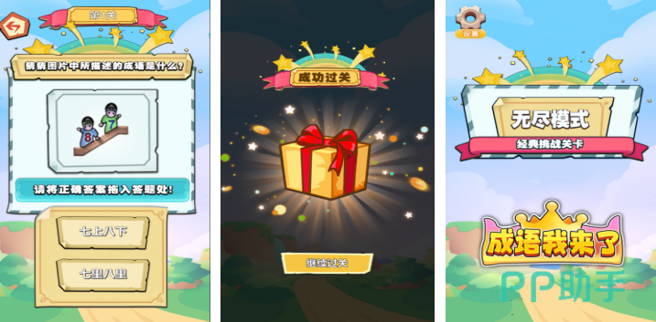 主打单机离线体验的深度闯关型产品,关卡结构呈阶梯式递进,前期侧重基础识记,后期融入谐音、拆字、反义、典故延伸等复合型题型。卡通化角色设定与动态反馈机制增强沉浸感,每个章节均配有知识点小结,适合学生群体进行系统性成语复习与能力巩固。