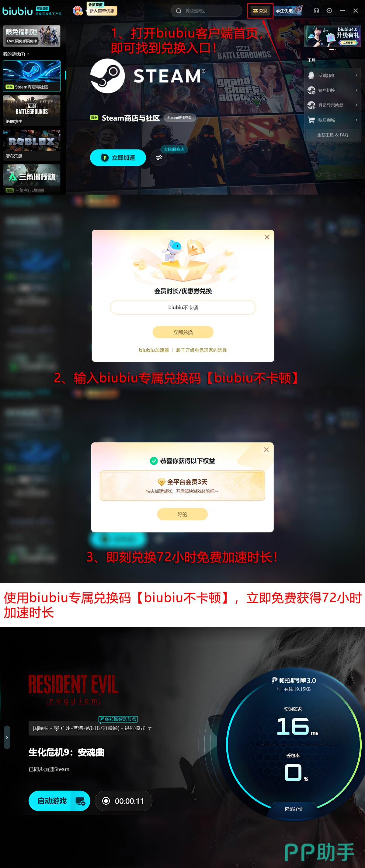 即刻注册biubiu加速器,新用户首次登录即可领取24小时免费加速时长;所有用户(含老用户)输入兑换码【biubiu不卡顿】,额外获得72小时加速权益,累计可享96小时零成本使用。
