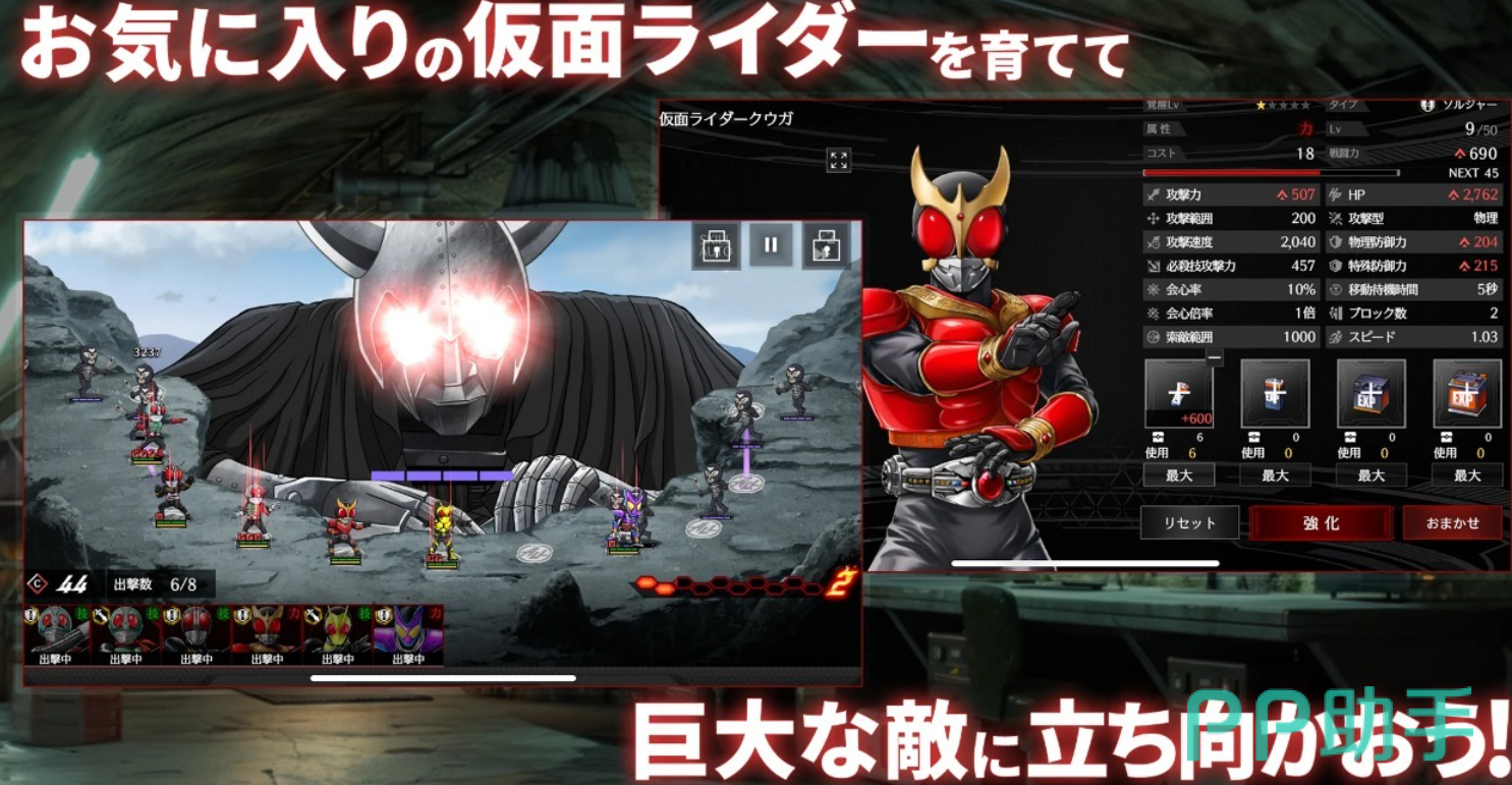 这是一款以像素美术风格呈现的策略放置类手游。玩家担任骑士战队指挥官,通过编组不同能力的假面骑士执行任务。战斗采用自动+手动双模式,角色建模保留原作特征,技能演出节奏明快。多骑士协同作战机制强化团队养成深度,关卡设计融合解谜与即时反馈元素。