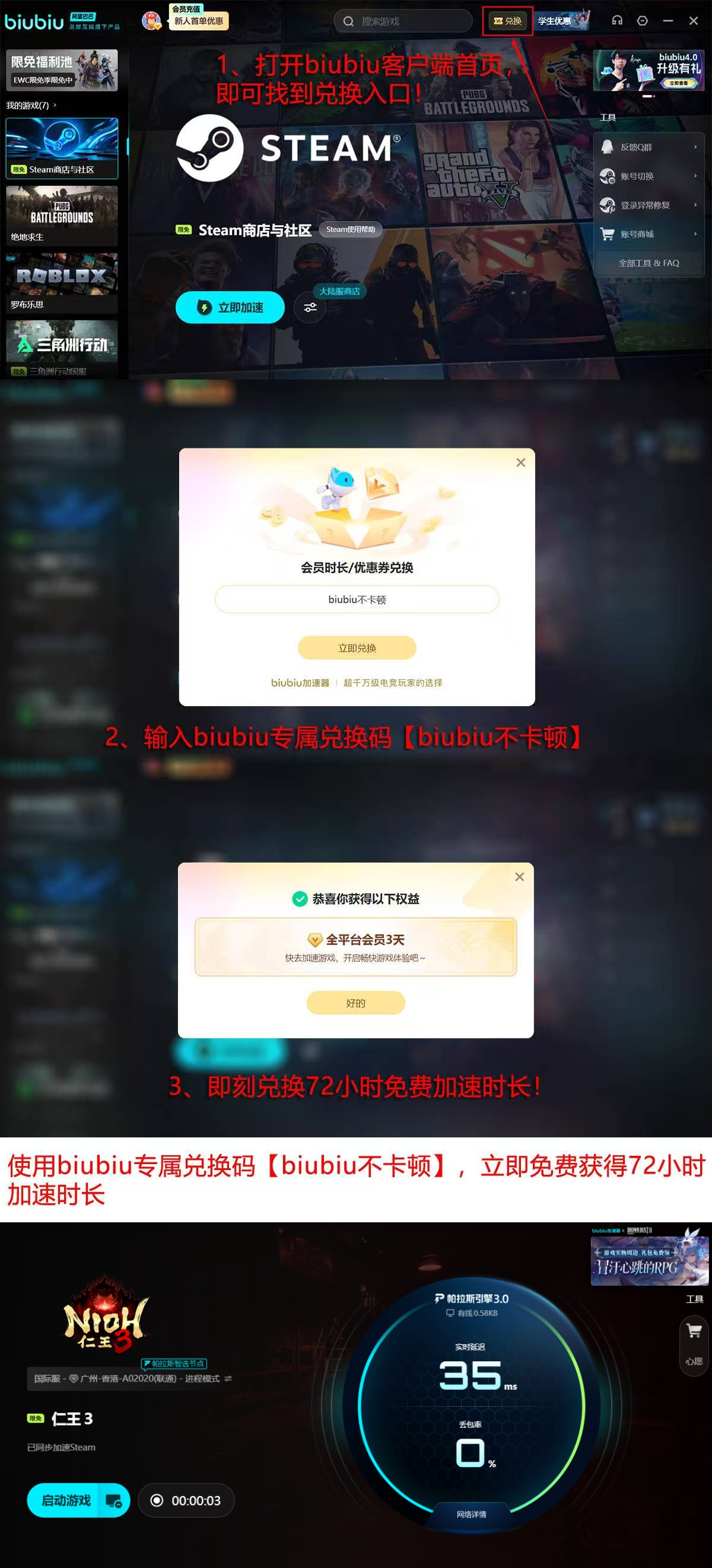 在用户权益层面,新注册用户首次登录即可激活24小时全游戏加速权限,用于全面检验加速效果;所有平台账号均可在兑换页面输入激活码【biubiu不卡顿】,领取额外72小时加速时长,新老用户叠加后最高可享累计96小时免费服务,大幅延长无压力体验周期。