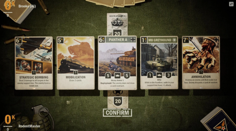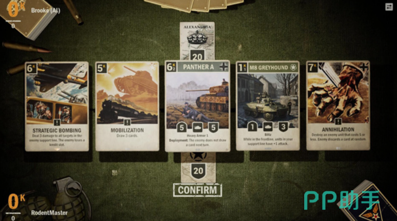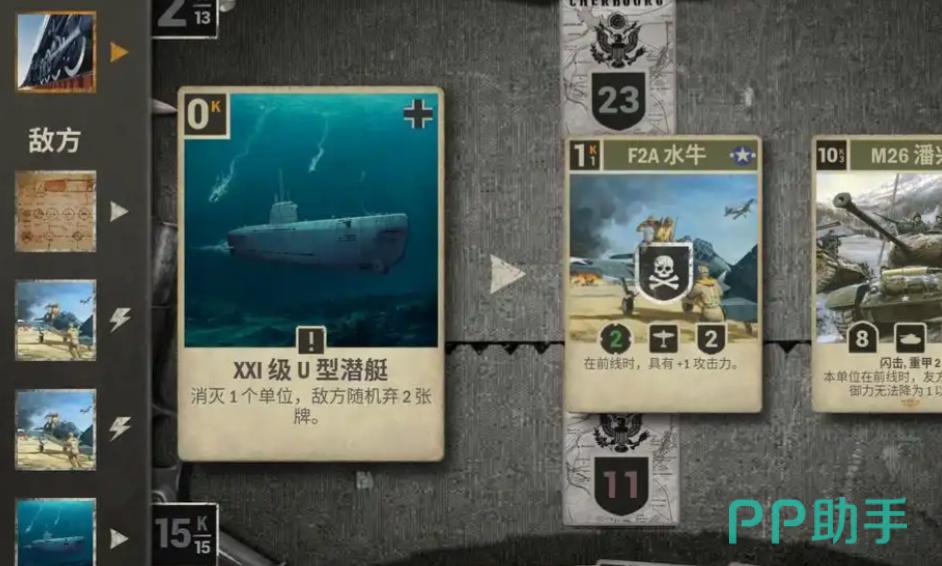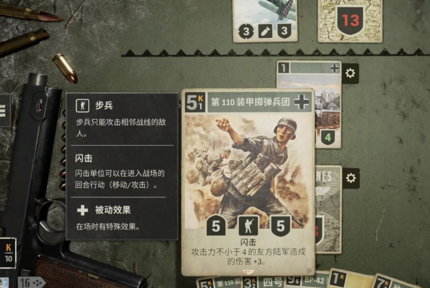 游戏采用三类基础卡牌构建战斗系统:单位卡、支援卡与命令卡。其中单位卡涵盖二战经典作战力量,包括坦克、战斗机、火炮、步兵及骑兵等实体作战单元,部署于前线区域参与直接对抗;支援卡则置于后方区域,主要承担总部防护、资源调度与战线稳固等功能;命令卡作为战术执行媒介,具备一次性使用特性,可用于强化己方单位属性、削弱敌方防御数值或触发特殊战场效果。所有行动均需消耗指挥点数——该数值为每回合核心战略资源,直接影响战术选择广度与节奏控制精度。