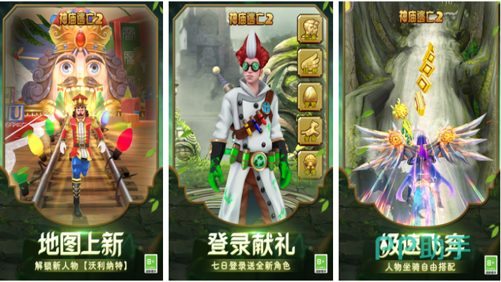 这款神庙逃亡第二代作品加入了更多的地图、角色和技能,甚至拥有翅膀和坐骑会增加角色属性,游戏里的登录奖励更多可以轻松完成跑酷任务,多样的主题地图全面上新带来的新鲜感不差,可以签到获得的奖励道具帮助大家快速轻松跑酷冒险,新人物、新服装也可自由解锁带来不俗的参与感。