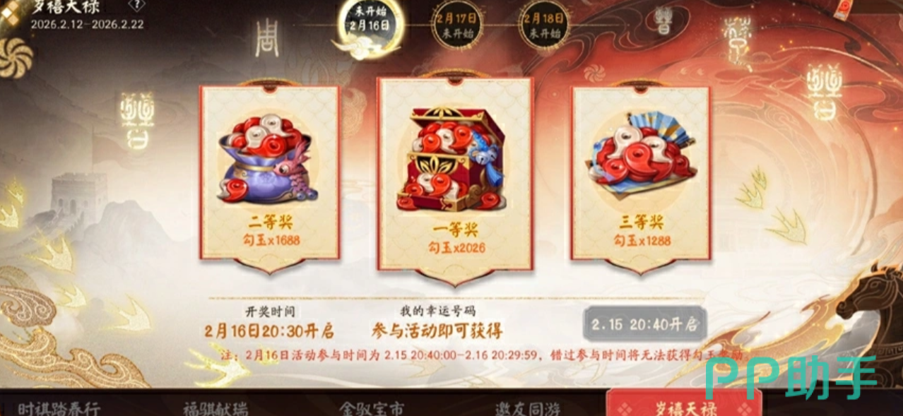 「岁喜天禄」为三日限时口令抽奖活动。每日设有独立开奖时段,玩家需在指定时间发送当日口令并消耗1张勾玉彩券,即可获取唯一幸运号码。每晚20:30准时开奖,中奖者将获得66至988不等的勾玉奖励。
