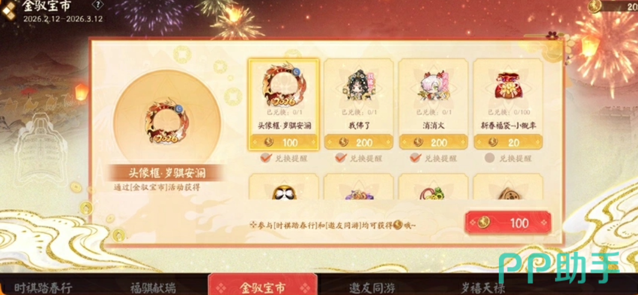 「金驭宝市」为资源兑换系统。玩家可使用活动中获取的金驭币,兑换吉愿达摩、新春专属头像框等实用道具;同时开放新春福袋兑换入口,单次兑换即有机会获得最高18888勾玉的稀有奖励。