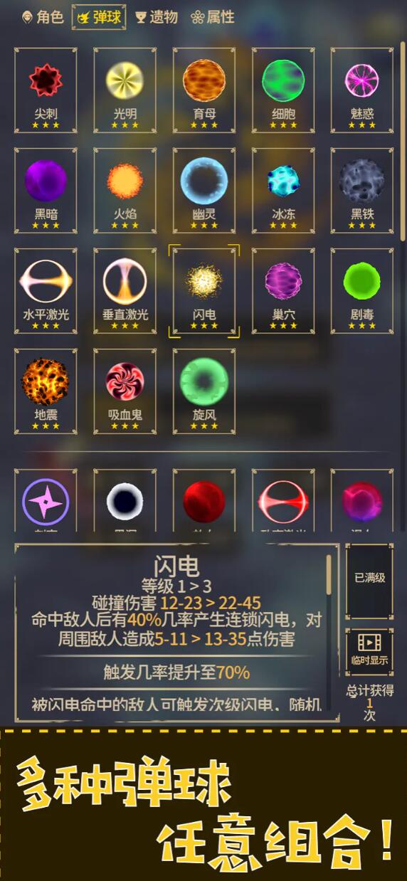在游戏最初将会有少量的基础弹球,玩家需要通过不断的闯关才能够积累大量的资源。随着玩家解锁更多的基础弹球之后,玩家则需要结合自身的玩法跟战局来自主的进行判断。除此以外,游戏当中还会涉及到多名角色,而每个角色所拥有的专属技能,以及弹球组合所形成的不同战术都是不一样的,在这样的情况下,玩家需要解锁角色跟技能强化,最终才能够完成手动操作。
