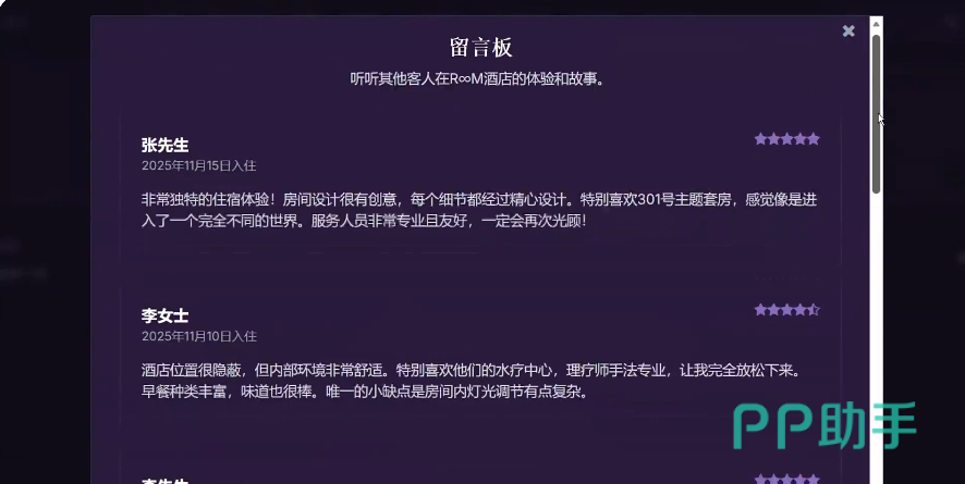 慢慢挖掘,只有找到结局页面才算成功;需要穿梭在酒店内部系统,住客社交账号,网络论坛私信这些页面,通过搜索和推理才能进行的叙事玩法,这里的每个房间都上演着不同故事,透过文字,可以窥见在门之后的人间百态。