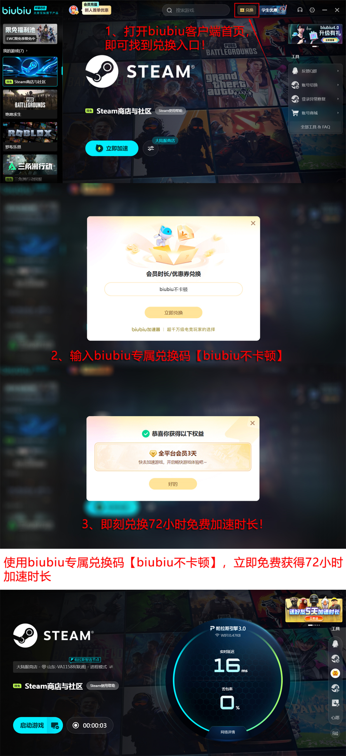 除了性能方面的优势之外,冰冰在福利方面也很值得关注,新注册的号可免费加速24小时。这样新人可以先免费试用。还有一项兑换码换加速时间,每个号都能用一次,兑换码是【biubiu不卡顿】,可换取72小时免费加速时间。新人两项福利都能享受到,总计96小时。