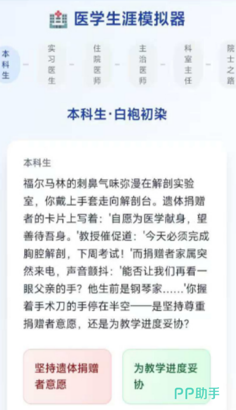 而在很多的环节面前,大家任意挑选,比如科研方向或者是临床实践等等,在每次的选择面前好像是站在了十字路口,自己的选择都会直接影响不同的结局,甚至还会影响未来的临床技能以及人际关系等等。其实从整个设计的过程中,和现实生活中的医学教育或者是各种职业环境都极为相似,就比如呈现出了不同的科室或者是手术室等等,还有急诊夜班等大家来亲自经历。