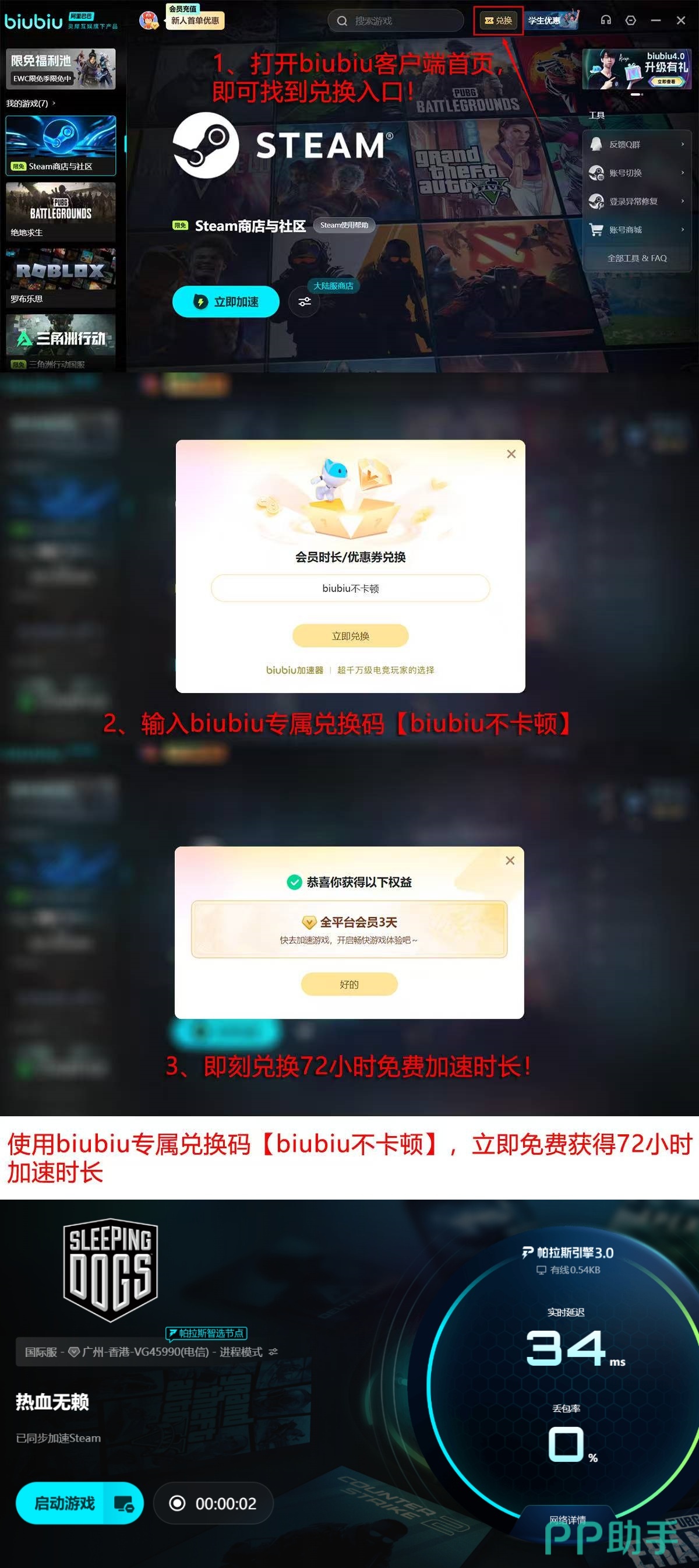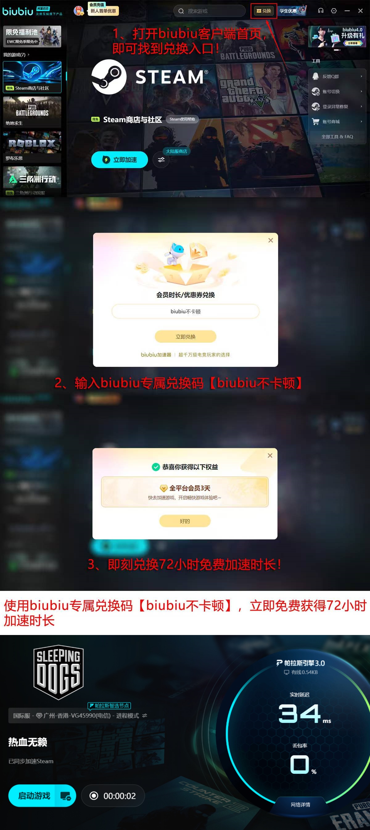 新注册用户首次启动biubiu加速器即可获得24小时全游戏免费加速权益。输入专属兑换码【biubiu不卡顿】还可额外领取3天连续使用权限,总计享96小时无限制加速服务。