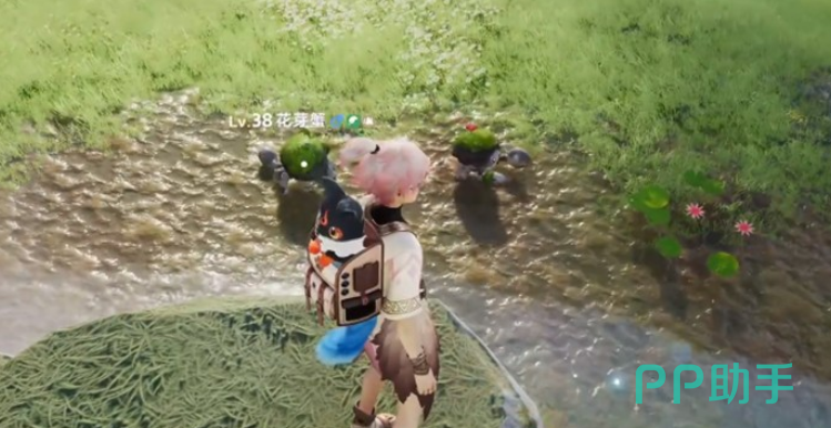 接下来要找的是冰骨仔和花芽蟹。回到刚才那个传送点之后,这次要往北边走。在一块很大的石头下方,基础形态的冰骨仔就在那附近活动。抓到冰骨仔以后,继续往北飞过去,会经过一段断层悬崖,飞到底部靠近小溪的位置,就能看到成群的花芽蟹了。这些花芽蟹等级大概在38级左右,数量还挺多的,想抓几只慢慢挑都行。
