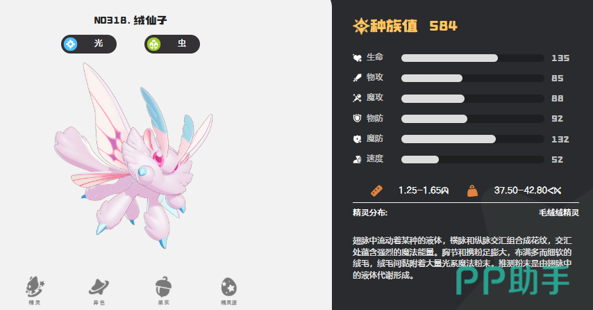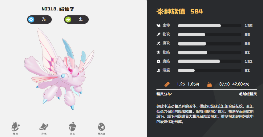 第一个介绍的种族值比较高的是生命数值比较高的绒仙子,这个精灵在此类数值上面达到162点的基础数值,如果大家选用绒仙子的话,其实她现在是可以在队伍当中根据不同系别的队友带来一部分的速度增益,主要是队伍当中大家要看不同元素的精灵多不多,这里每拥有一种不同元素的精灵作为队友时,这个精灵的入场速度就会增加10点的效果,所以可以克制效果也是相当不错的,利用这个特性,绒仙子可以在自己所在队伍当中带来更高的速度提升百分比,如果没有绒仙子,其实大家也可以试试蹦床松鼠,他也是这个生命基础数值比较高的一个精灵,基础的数值达到161,只比绒仙子低1点而已。