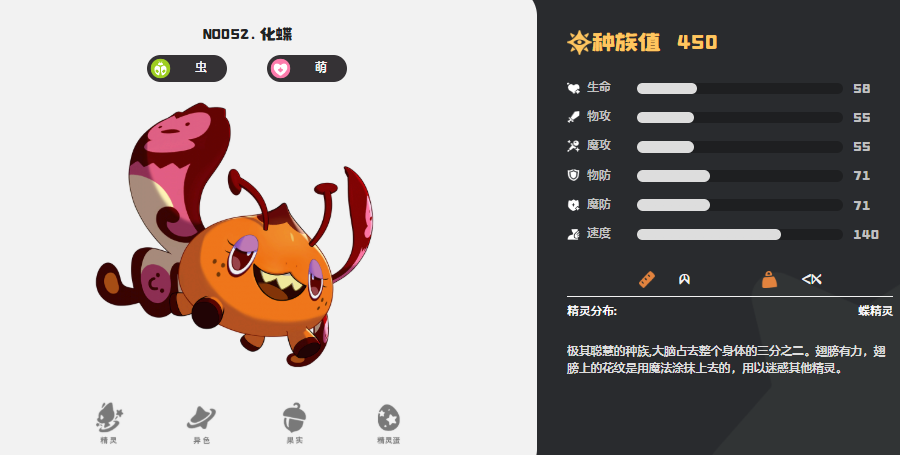 第二个为大家介绍的就是化蝶,这个精灵是在速度数值当中排行比较高的,化蝶自身的速度数值处于140点的基础能力上,而在用化蝶的时候大家就可以主要用到她的特性,在这里化蝶是可以根据自己的特性保护自己的,只要化蝶上场,那么在场内如果受到对面的攻击,且这一次的攻击是有致命效果的话,那么化蝶是有一次机会可以直接免疫此次上海效果的,而此时化蝶自身除了免疫之外,还有一个额外的状态可以触发叫做萌化,这个状态自然是可以为化蝶带来更多的场内效果的,如果大家没有拿到化蝶,其实也可以选择星光狮子,因为他的基础速度数值也是达到了135的效果,所以也可以算是化蝶之下第二个有高速度加成的精灵。