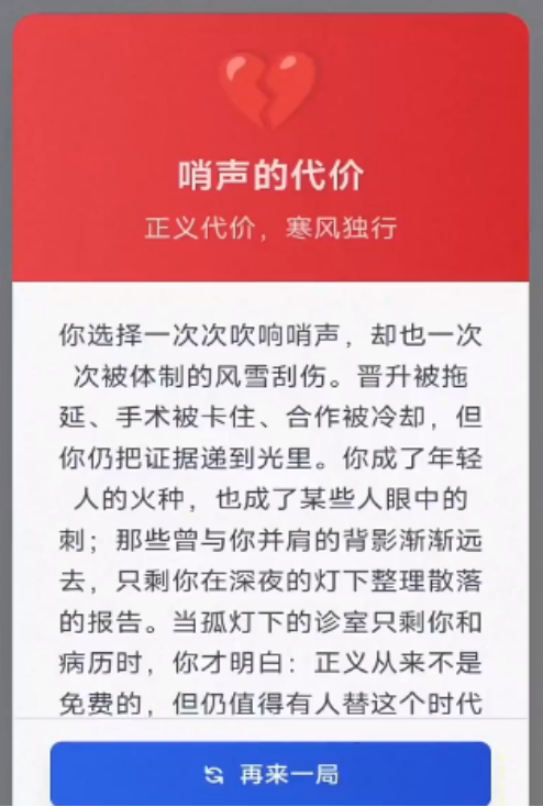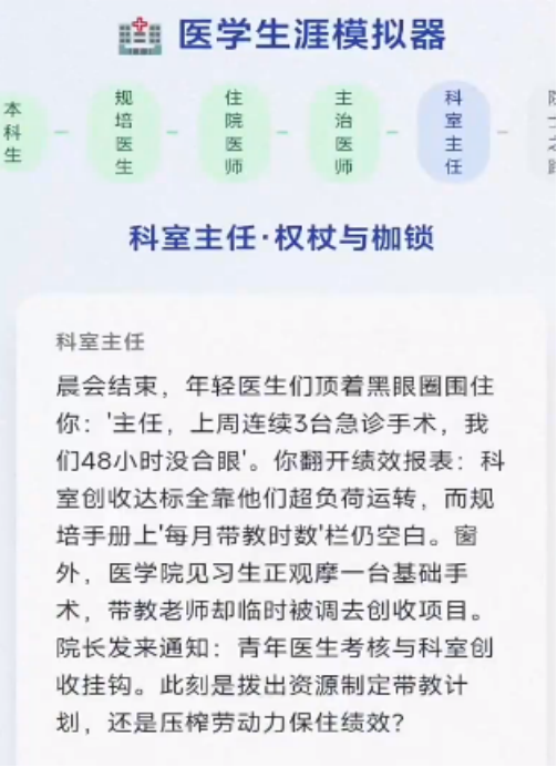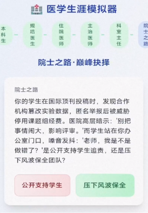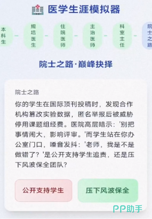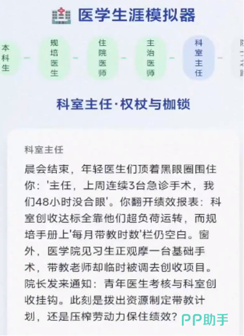 这里呈现出了大量的决策,每个决策都是由自己来决定,就连游戏的进程也完全依赖于自己的选择,就比如在每次的选择面前,好像站在了分岔路口。而且也将会影响整个人物角色在整个医学领域当中的成长,而且还有可能会直接影响到各个维度,比如人际关系或者是临床技能等等,都会塑造出不同的结局和成就,每一个关键阶段都非常重要,比如有职称晋升或者专科选择等等,都可以让自己快速实现目标,成为整个医学领域中优秀的人物。