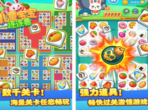 基于传统连连看机制优化适配儿童用户的版本,内置经典、挑战、极速、闯关、计时共5种模式,总计逾千关。图案以水果、蔬菜等健康食物为主视觉元素,连线路径自动识别,消除反馈清晰友好。不同模式侧重训练目标各异:极速模式锻炼反应速度,闯关模式强化策略规划,整体符合教育部《3—6岁儿童学习与发展指南》中关于感知运动与问题解决能力的发展要求。