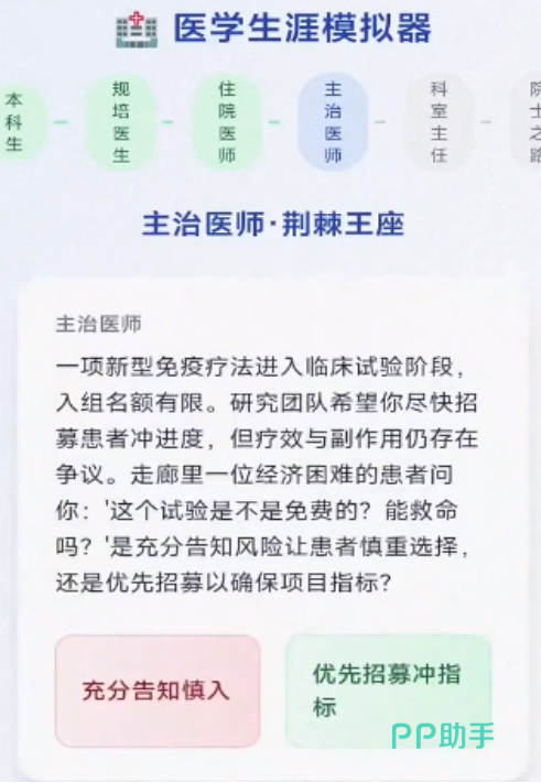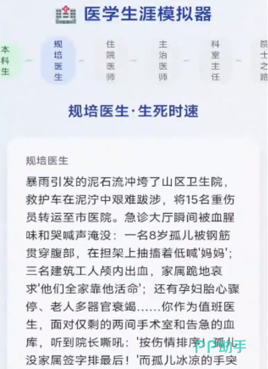游戏开局即代入一名医学院新生身份,在兴趣驱动下开启系统性医学训练。从基础理论学习到实验室实操,从见习带教到独立接诊,每一步成长均需匹配真实医学逻辑——课程选择影响专科技能树分支,实习表现决定导师推荐权重,重大诊疗决策直接关联结局走向与行业声望值。场景设计深度复刻高校医学部、三甲医院手术室、标准化实验室等典型环境,强化沉浸式职业代入感。