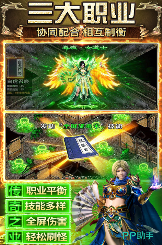 游戏中设有战士、道士、法师三大基础职业,技能释放逻辑清晰,无复杂连招门槛。其中战士职业拥有较高基础生命值与稳定近战输出能力,特别适合初次接触该类玩法的用户。其前排承伤与小范围控制特性,亦能在组队副本及帮会战中发挥关键作用。