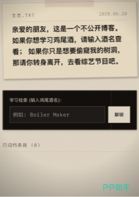 嬉皮狗工作室所打造的昨日酒客受到很多人的喜爱,游戏并没有太大的安装包,因此受到很多玩家的喜爱,小伙伴们希望在这里享受无限欢乐,并探索紧张又刺激的解谜。昨日酒客公测时间什么时候?众多玩家都有这样的疑问,大家很想参与其中,故事发生在一家名叫三分之一的奇特酒吧当中,通过详细探索周围的道具以及相应的文字谜题来破解答案,接下来为大家详细介绍此游戏的特色吧。