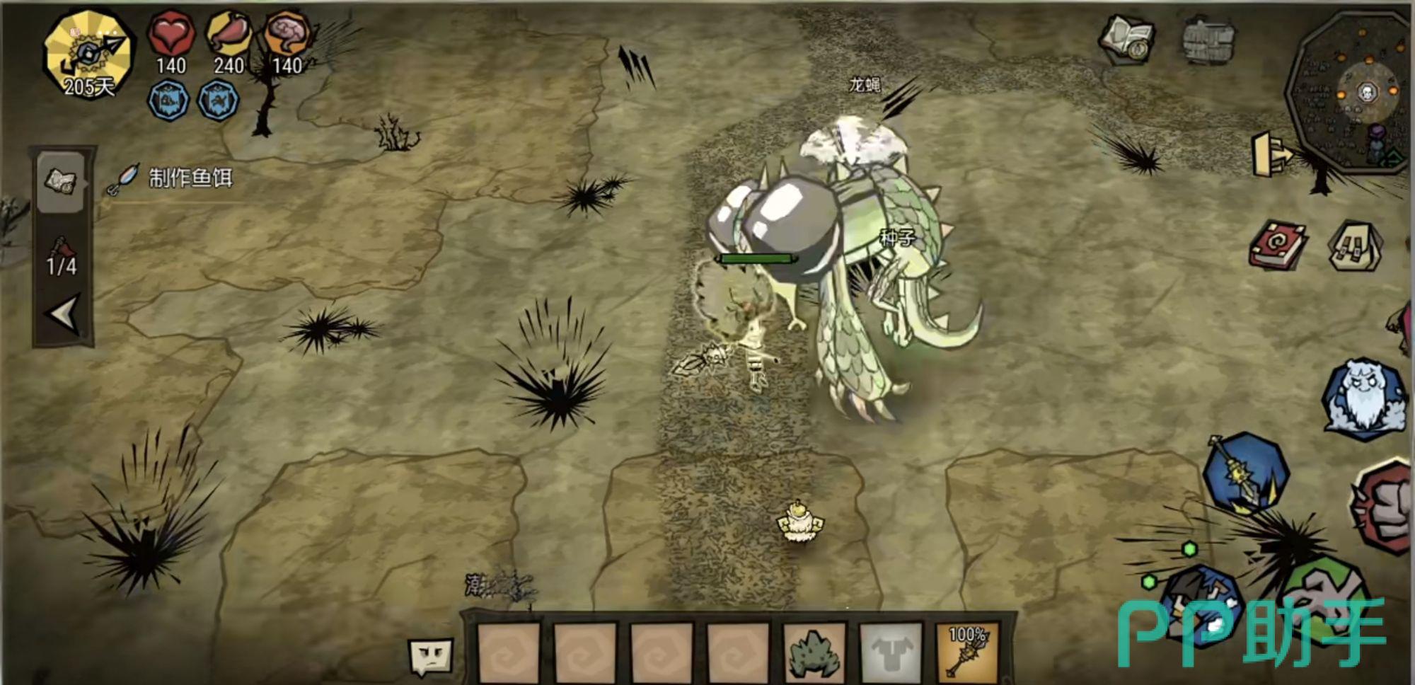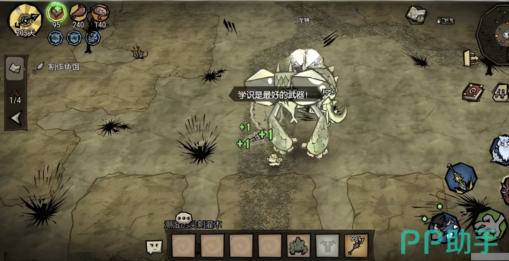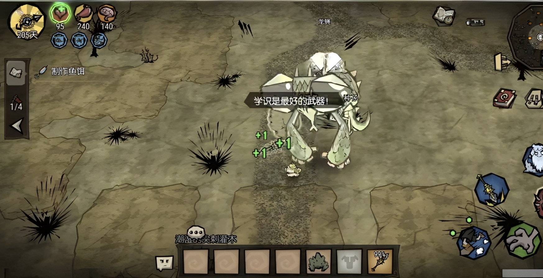 最后一个重要的值数是理智值,玩家需要有聪明智慧的头脑,让角色无论在什么情况下都能够保证在安全的状态,理智的值数通常会在下雨和天黑以及遇到害怕的生物的时候就会极速的下降,如果值数过于地下,那么,角色就会出现幻觉影响对怪物的进击能力,最后导致无法存活,玩家可以通过摘取鲜花或者是休息,也可以经过穿搭特制的服装饰品和食物来进行回升。