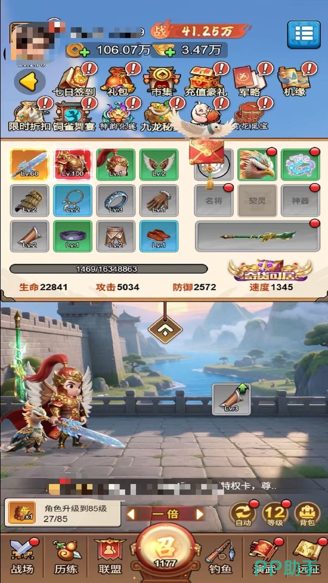 点击战斗界面后,可以看到角色的生命值,攻击力以及防御值,根据角色的能力变化可以参与到联盟任务,或者是不同等级的战场上对抗敌人和boss。除此之外,还设置了钓鱼,演武,远征等具有休闲和竞技特色的玩法,作战时可以从背包中任意选择武器装备为三国武将进行佩戴,击败的敌方数量越多,获得的金币和元宝数量将会更加丰富。