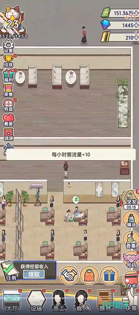 员工系统包含能力图谱、技能树与幸运号码机制:每位员工拥有基础属性(亲和力、手法熟练度、响应速度),可通过培训课程定向强化;分配特定数字编号可激活临时加成效果,考验玩家在排班调度与人力配置中的策略决策能力。