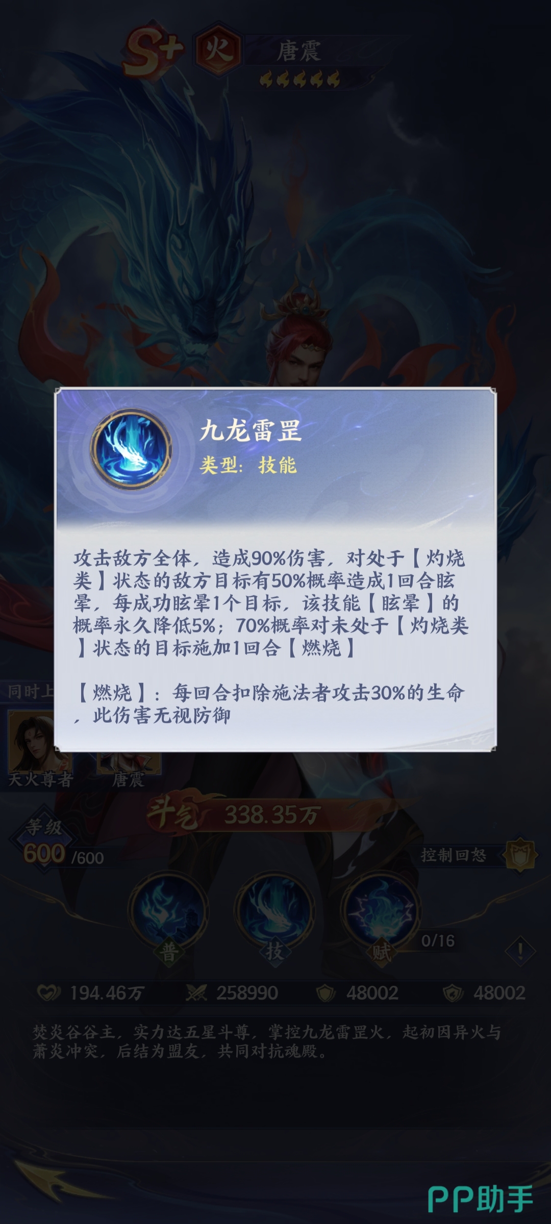 其实玩家在选择唐震的时候,也需要了解它的核心技能,比如九龙雷罡,它能够起到控场的作用。在战斗的过程当中,他如果施展了群体伤害,那么将会对敌人造成攻击伤害。这样就可以为输出做好充分的准备。当然它还能够燃烧。施展这个技能之后就可以对未处于灼烧状态的敌人进行施加燃烧,通常情况下每回合将会扣除敌人的攻击生命,并且这样的状态是不需要考虑敌人的防御性能。额外它还有眩晕控制的作用。