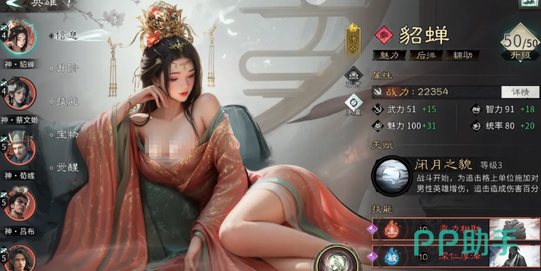 在《三国天下归心》这款策略卡牌游戏中,貂蝉作为高人气辅助型武将,长期稳居玩家阵容构建的核心位置。尽管她不具备顶尖的持续承伤能力或单体爆发输出,但凭借机制独特、效果显著的多重控制与团队增益技能,成为中后期推图、竞技场及高难副本中不可或缺的战略支点。