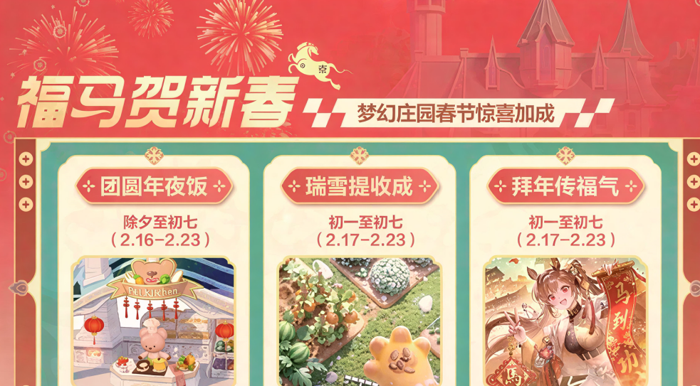 版本上线后,首波变化是全局主题场景焕新。游戏主界面将切换为冬日雪景主题,包含多组差异化雪境地图,整体画风清冷灵动,细节丰富。部分雪景背景支持限时获取,玩家可通过指定渠道兑换或购买。紧随其后的是除夕专属烟花秀——仅在农历腊月三十当日开放,届时梦幻庄园夜空将呈现动态光影特效,营造沉浸式跨年仪式感。该活动虽不提供道具奖励,但强交互性与高观赏性显著提升节日代入感。