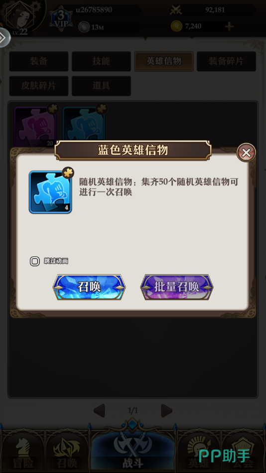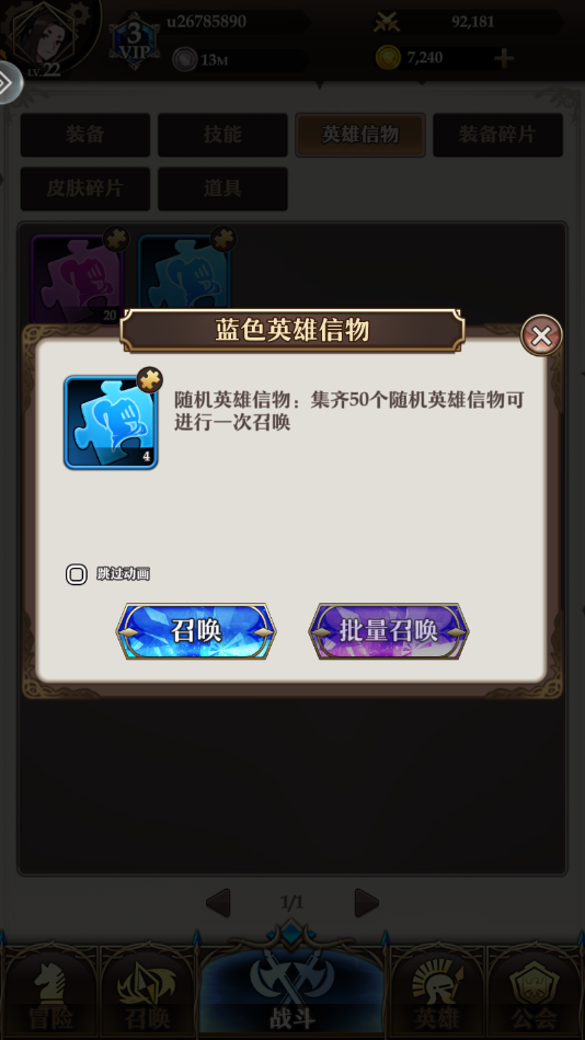 (1)信物作用:积攒五十个英雄信物可以直接召唤指定类型的英雄,信物一共分为四种,分别是蓝色信物、紫色信物、指定信物、限定信物。根据信物的类型来召唤指定的角色,其中限定信物是需要花钱才能得到的。