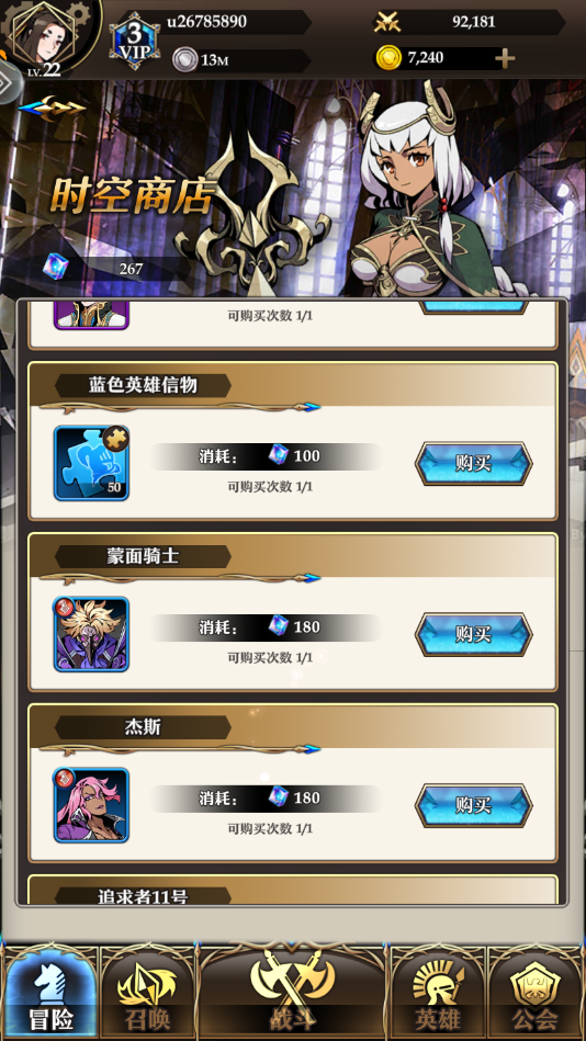 3、时空探险:使用时空探险的积分也可以直接兑换指定英雄信物,玩家等级越高获得积分也就越多。