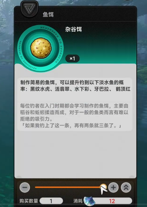 然后是杂谷饵这个东西。这种鱼饵的制作材料,主要就是稻谷加上蚯蚓混在一起揉成的,配方听起来挺朴素的。用它来钓鱼的话,会明显提高钓到黑纹水虎、活翡翠、水下彩、牙巴拉,还有鹤顶红这几种淡水鱼的概率。基本上每个刚学钓鱼的玩家,都会先接触到这种饵料,因为它制作起来比较简单,材料也容易弄到手。如果你现在就是想,专门针对这几种淡水鱼类去钓的话,那杂谷饵肯定是比较合适的选择。