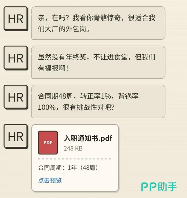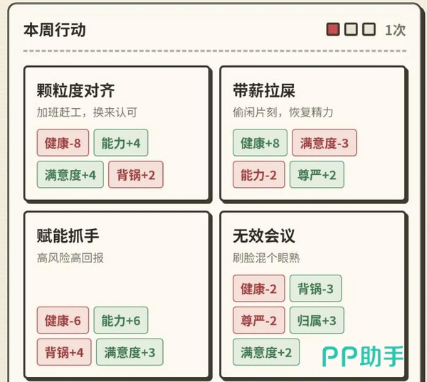 作为一款以真实职场压力为蓝本的模拟作品,玩家将扮演一名外包岗位从业者,在虚拟的大厂协作体系中承接项目、协调排期、响应需求变更,并在有限行动点数下权衡效率与健康值、KPI完成度与人际关系维护等多重变量。游戏采用阶段推进式节奏,每季度需完成目标考核,同时应对加班邀约、临时插单、流程卡点等典型场景,强调策略规划与长期决策能力。