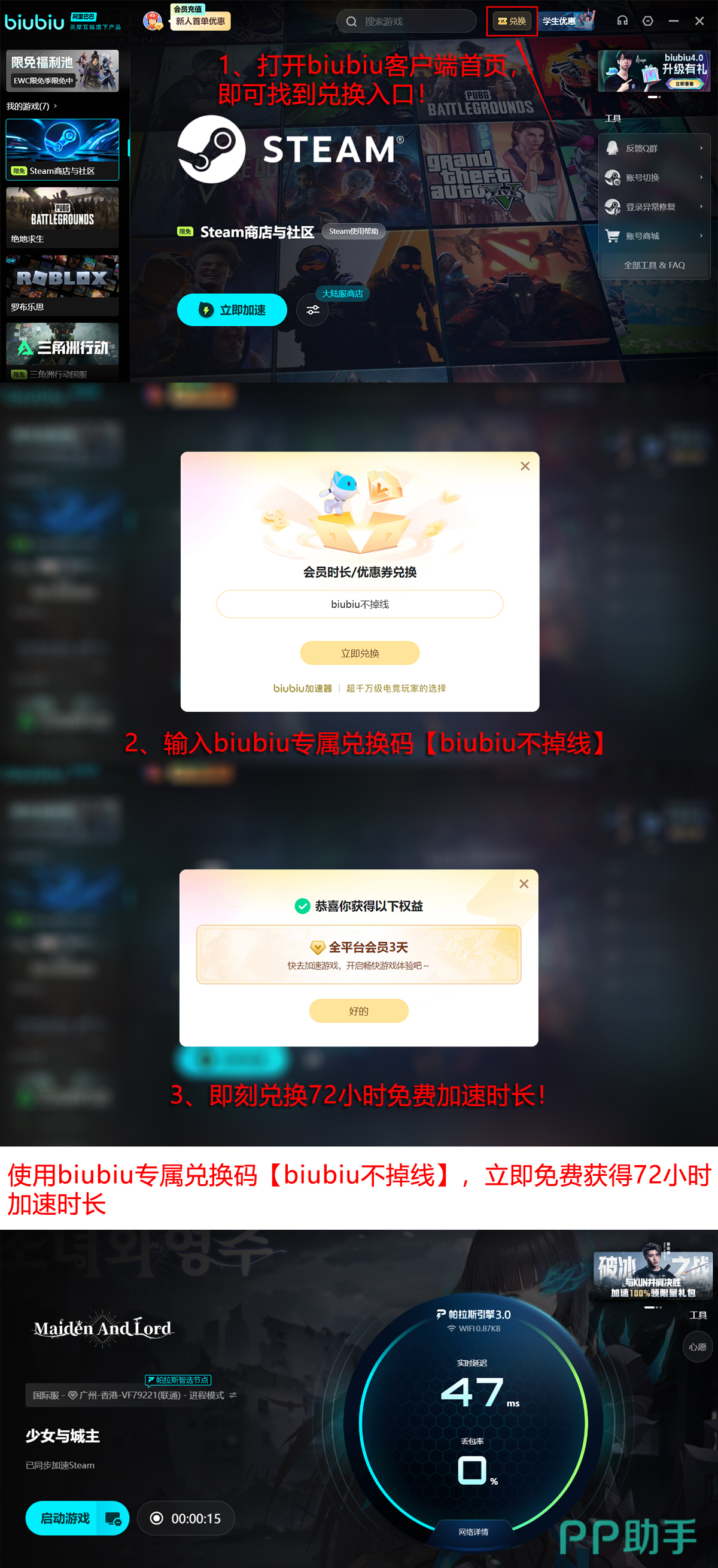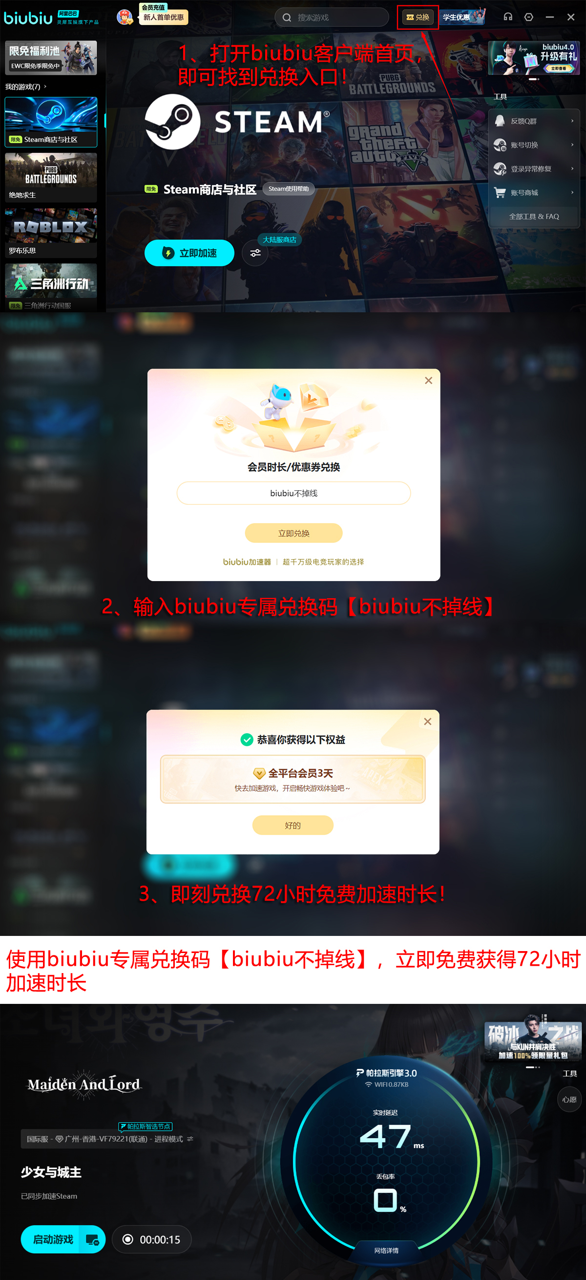 目前biubiu加速器面向全体用户推出限时福利:所有已安装客户端的用户,输入激活码【biubiu不掉线】即可即时领取72小时全游戏加速服务;新注册用户完成首次登录后,系统将自动发放24小时全平台通用加速权限。两项权益叠加,新用户可累计享有96小时免费加速体验,足以支撑完整通关多个主线章节。