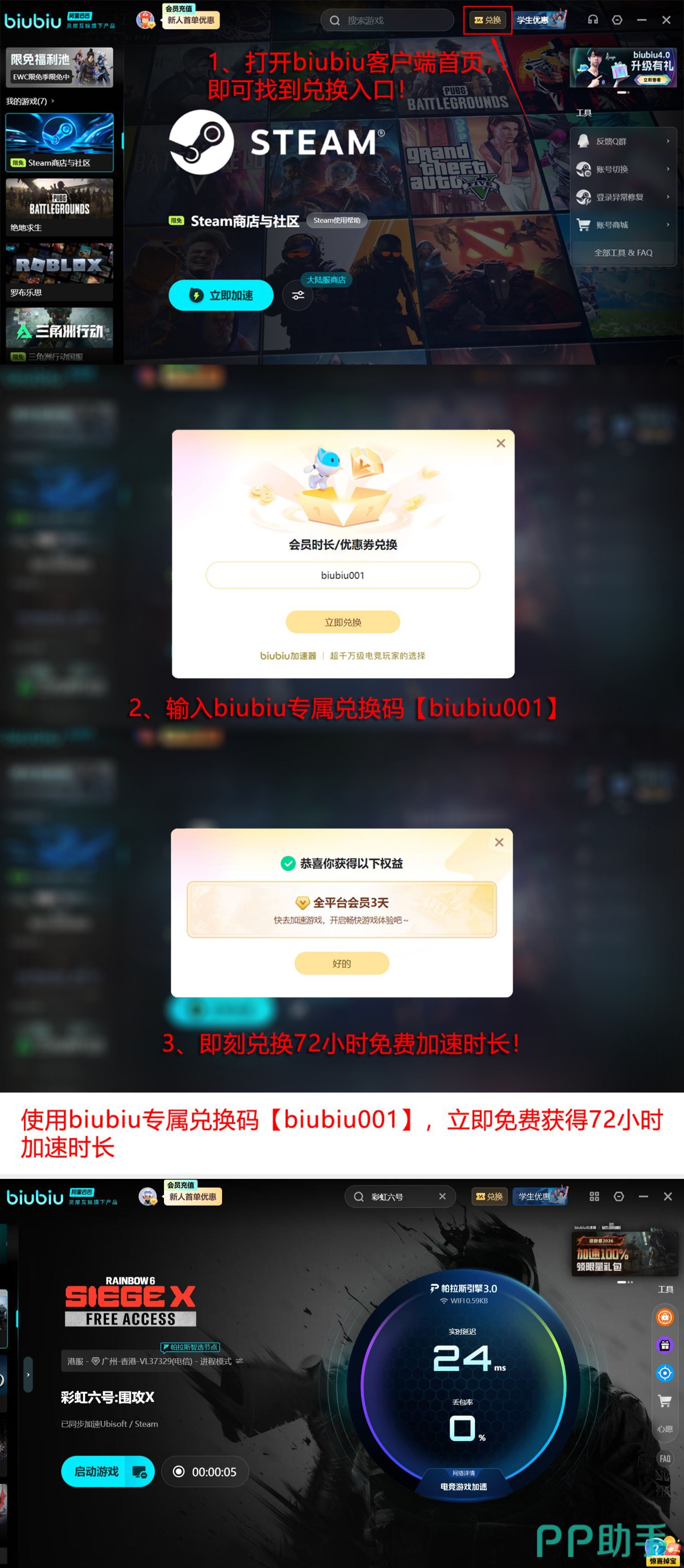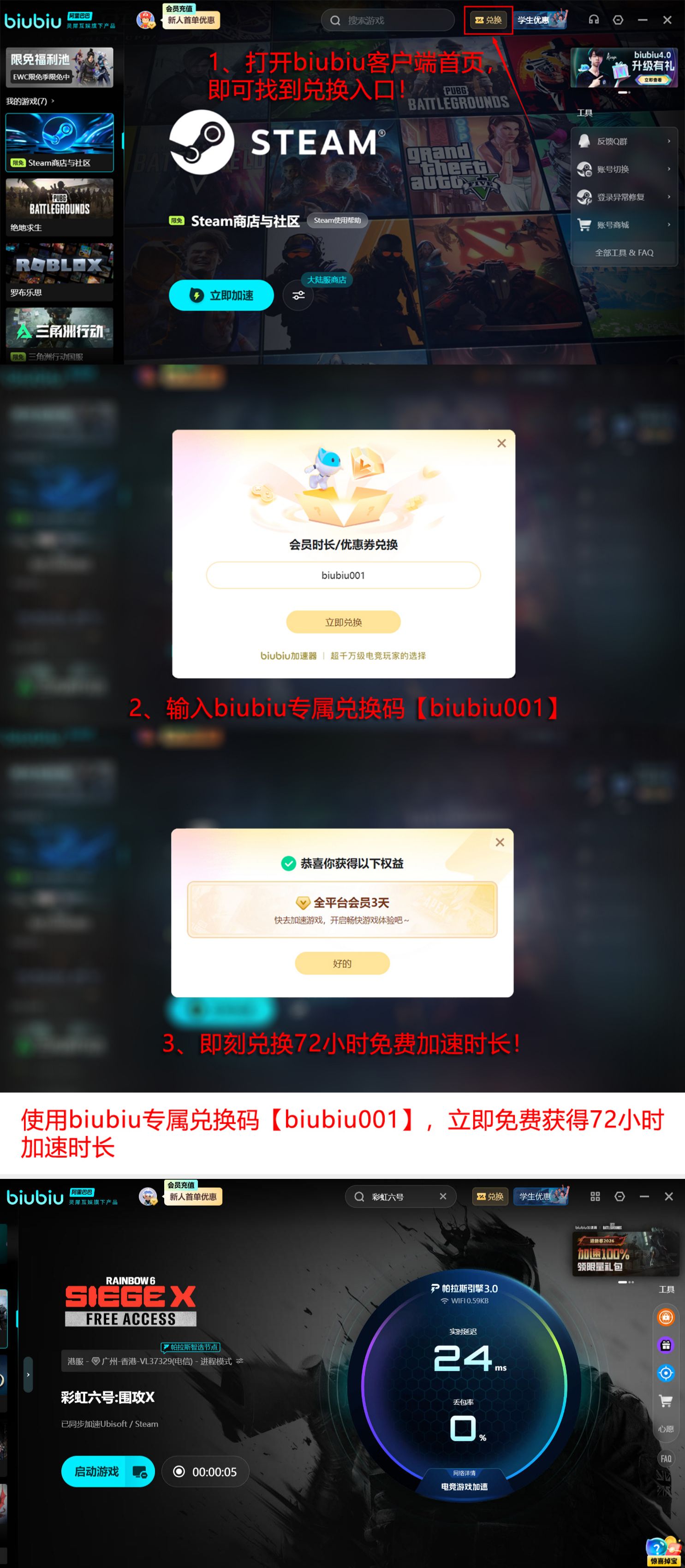 该方案已获职业电竞选手小叮当公开认可,并作为其日常训练环境的标准配置之一。交互设计强调极简逻辑:启动后于搜索栏输入“彩虹六号”,一键启用加速策略,新老用户均可零门槛上手。注册即赠24小时免费加速时长,叠加专属兑换码【biubiu001】可额外获得72小时权益,总计达96小时,完整覆盖双休日高强度联机需求。