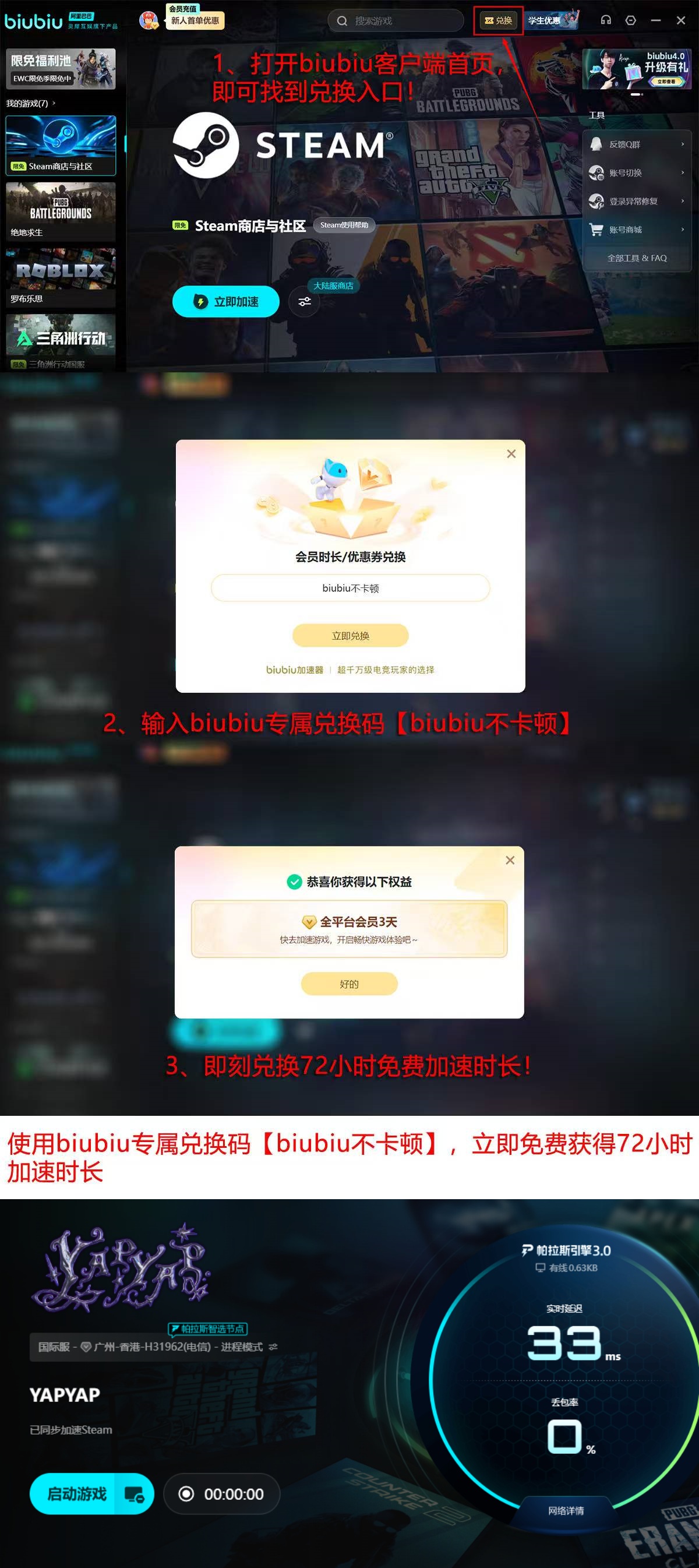 新注册用户首次启动biubiu加速器即可获得24小时免费试用权限。若在激活界面输入兑换码【biubiu不卡顿】,还可额外领取72小时加速时长,累计享96小时无限制网络优化服务。