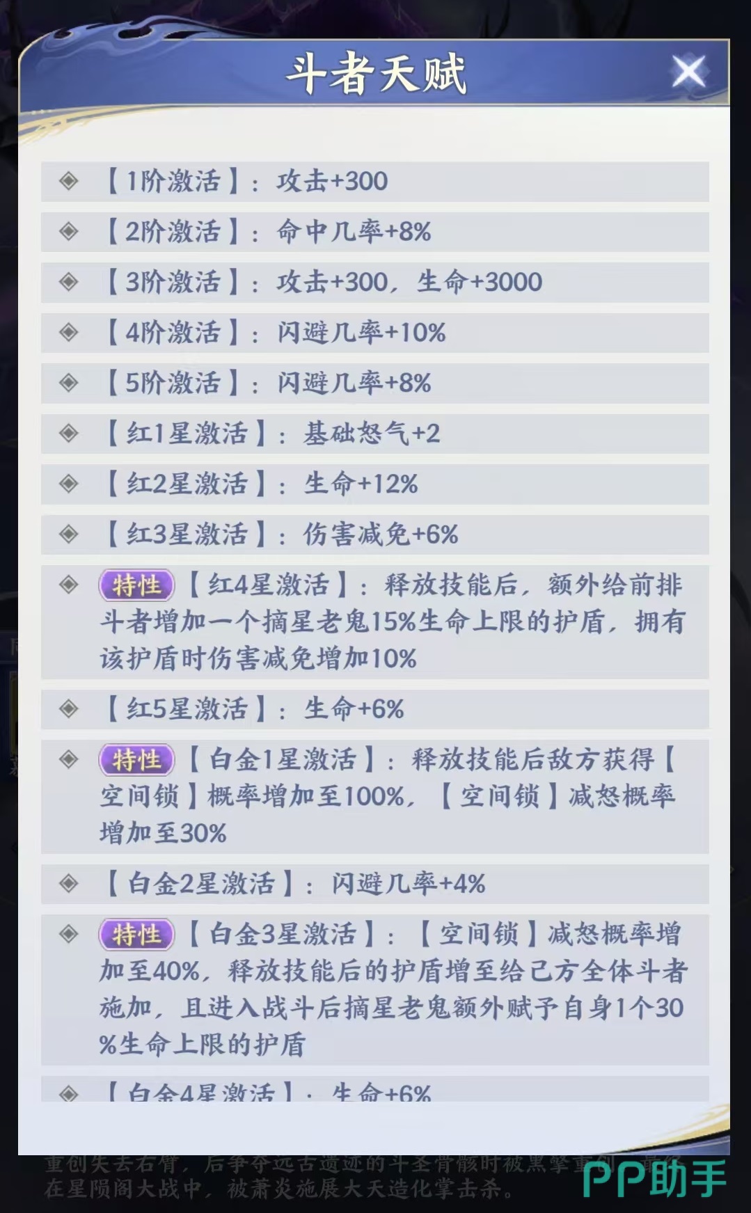 角色养成路径清晰且效果显著:升至红四星后,释放技能可为前排斗者附加护盾,提供稳定伤害减免;进阶至白金一星时,“空间锁”命中率提升至100%,减怒触发概率同步增强;抵达白金三星后,护盾覆盖范围扩展至己方全体,并在战斗开始时自动赋予摘星老鬼自身一层初始护盾;当突破至粉彩一星,若其所施加的护盾被敌方击破,则有概率使对应目标陷入眩晕状态。由此可见,摘星老鬼并非起步即强的速成型角色,而是典型的高成长性限制系斗者,越到后期越能发挥体系压制力。