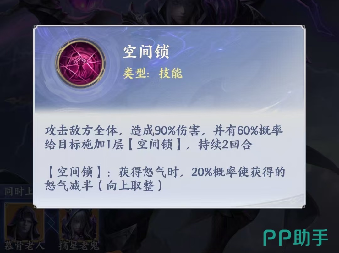 摘星老鬼拥有专属属性“水”,评级为当前版本最高档位S+。他与慕骨老人存在协同羁绊:双人同时上阵时,全队额外获得15%防御加成。其核心技能“空间锁”为全体范围伤害技,命中后必施加一层持续两回合的空间锁状态;该状态触发时,敌方每次获取怒气均有概率减半——此为关键控怒机制,直接削弱对手大招释放频率。