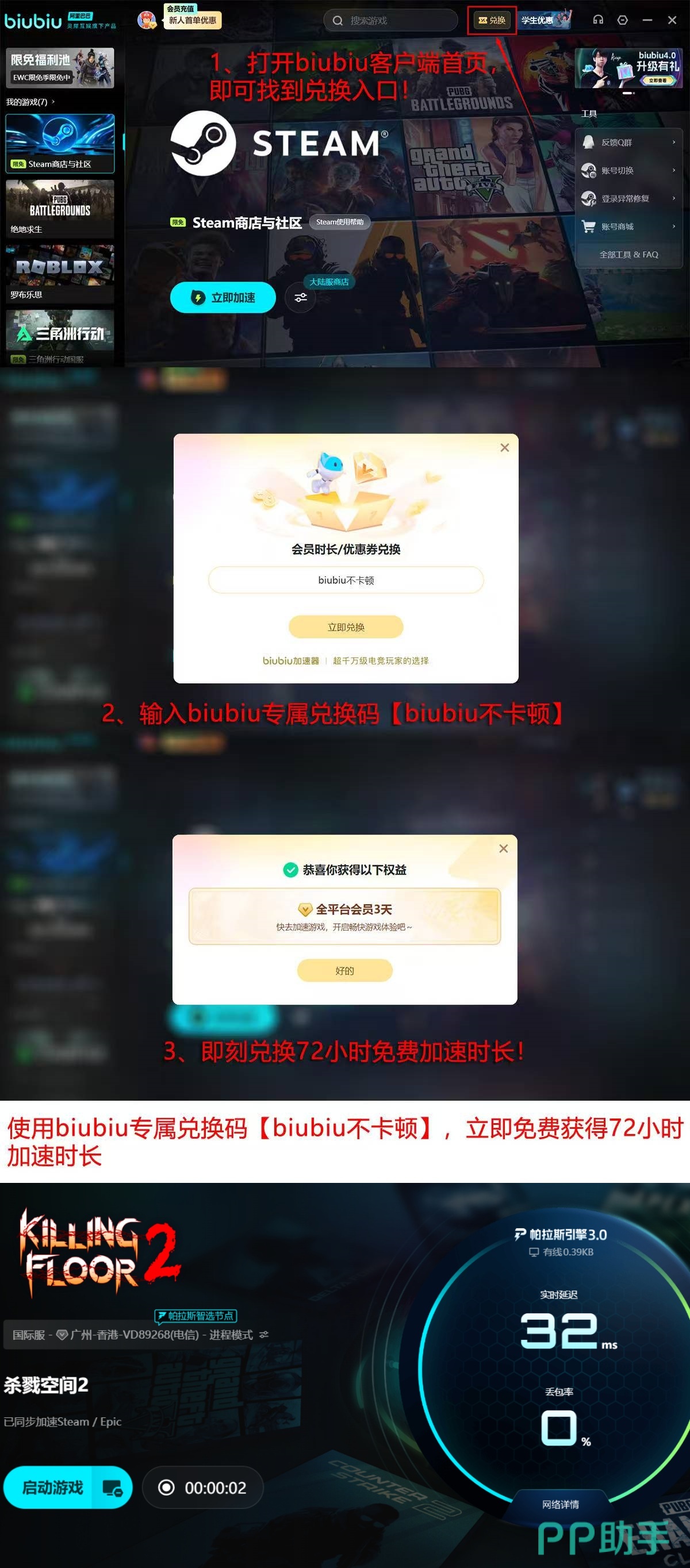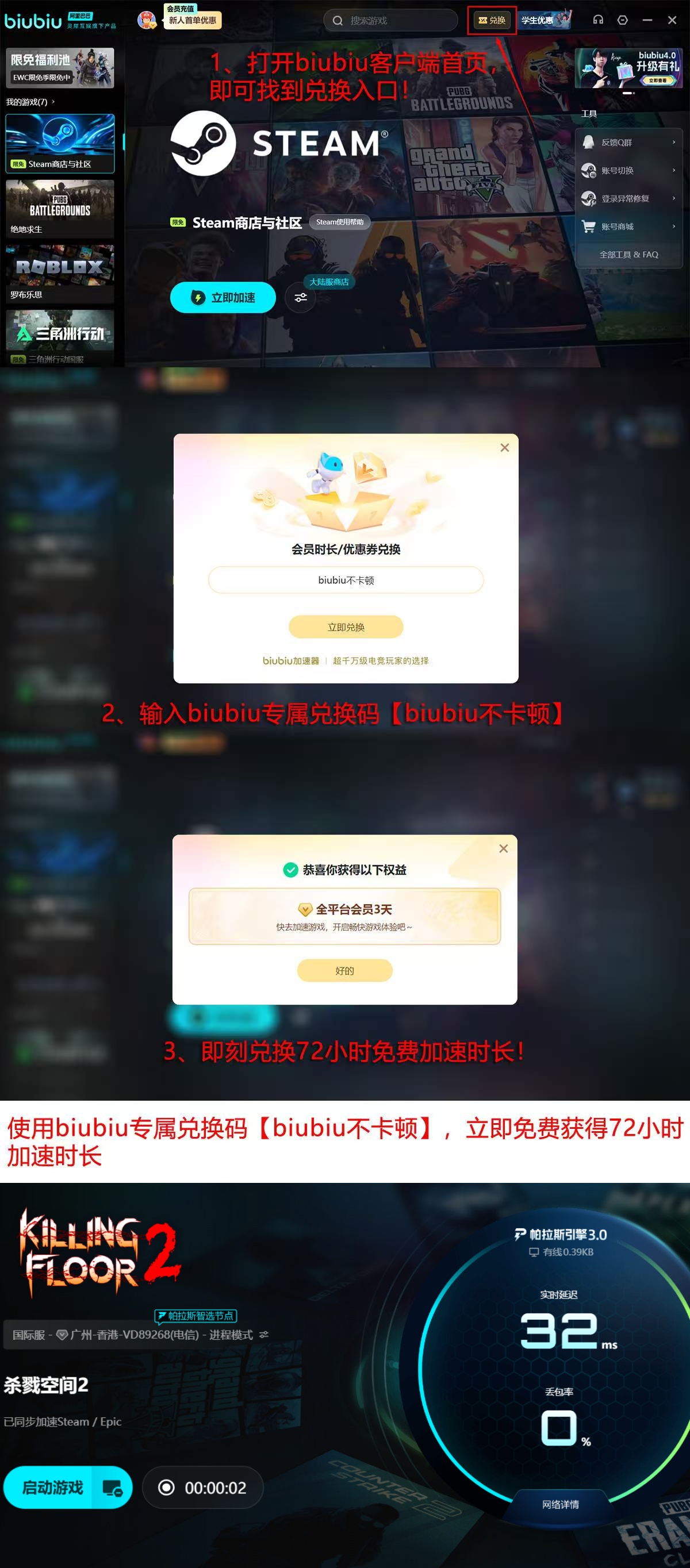 针对首次使用用户,平台提供基础加速权益:注册登录后即可获得24小时全游戏免费加速时长;输入专属兑换码【biubiu不卡顿】,还可额外激活连续72小时的加速权限,无需绑定支付方式即可启用。
