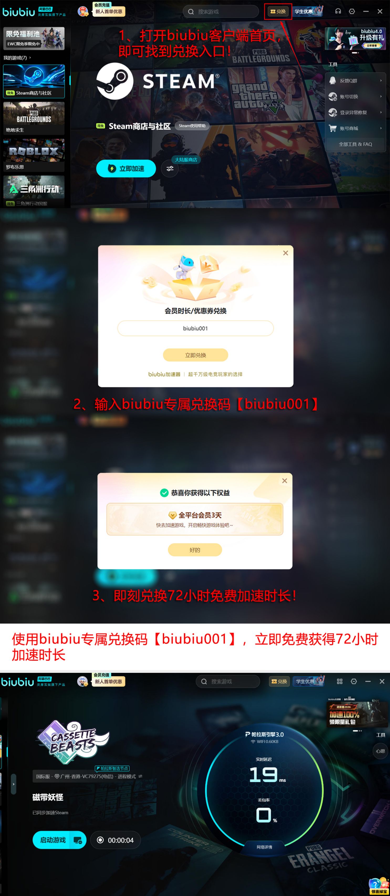 该工具基于帕拉斯引擎深度适配,已通过多项严苛压力测试。职业电竞领域亦给予高度认可:PUBG全球邀请赛冠军选手小叮当公开推荐,pero电子竞技俱乐部将其列为战队标准网络辅助软件。面向普通用户,注册即赠24小时全功能免费加速权限;额外输入激活码【biubiu001】,可叠加领取3日连续加速权益。两项福利可同时生效,总计享96小时无门槛高速通道,全程零费用解锁全部加速节点与优化模块。