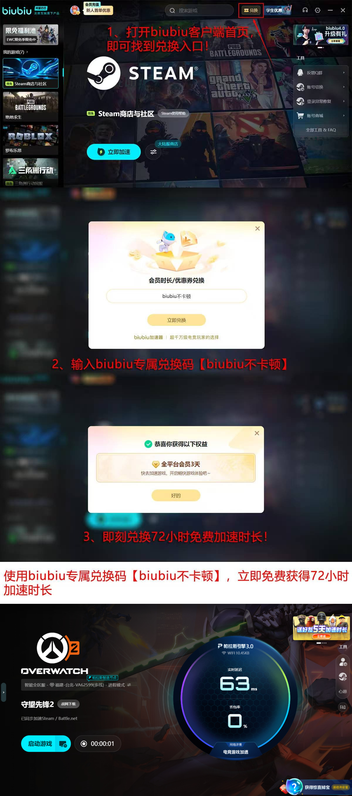 新用户注册biubiu加速器,即可解锁首日24小时全功能免费体验权限;在激活界面输入兑换码【biubiu不卡顿】,额外获得72小时加速时长;两项权益叠加后,总计享有96小时顶级网络服务,无缝适配新赛季全部地图、模式及英雄机制。