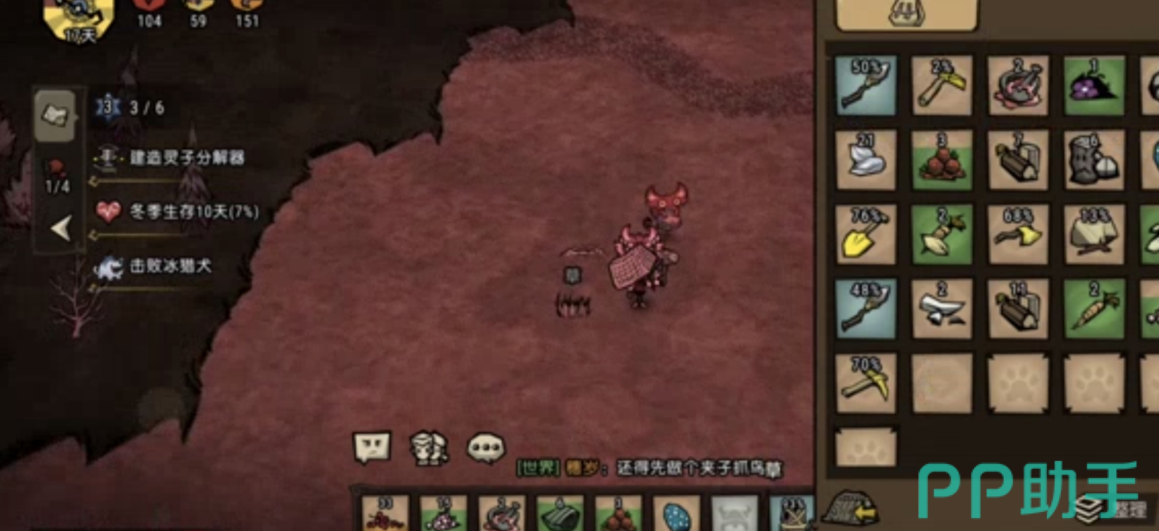 在游戏里面,玩家要根据天气的变化有计划的探索收集,比如白天的时候玩家可以收集一些花朵,每一朵花都能够让角色的心情畅快,增加理智值的5个点数,还可以,尽可能的多收集资源装备自己,当游戏内的场景进入黑夜的时候,玩家要注意避免一个人独自出行,或者是和怪物对战,因为这些活动会影响理智值的降低,玩家可以在夜晚的时候在庇护所进行休息,防止理智值的下降。